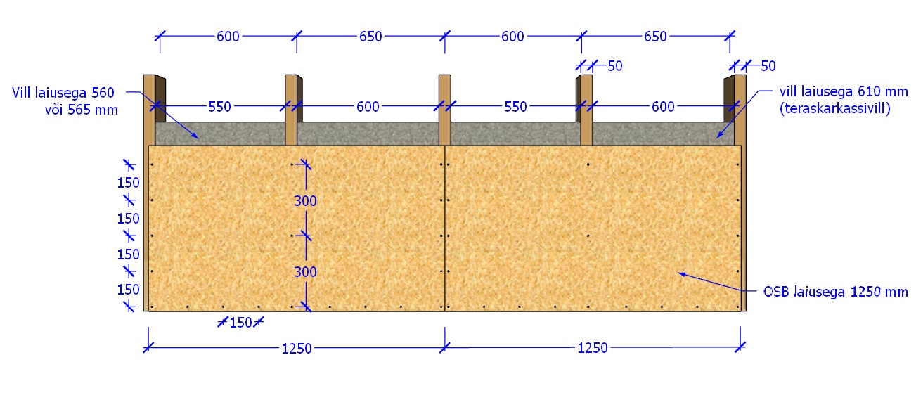 Selgitav joonis: OSB plaadi laiusmõõt ei sobitu 600 mm karkassi sammuga juhul kui tahaks seina soojustada. Karkassi vahele plaatvilla laius on 560 või 565 mm. Sealjuures tuuletõkkeplaadid on laiusega 1200 mm.