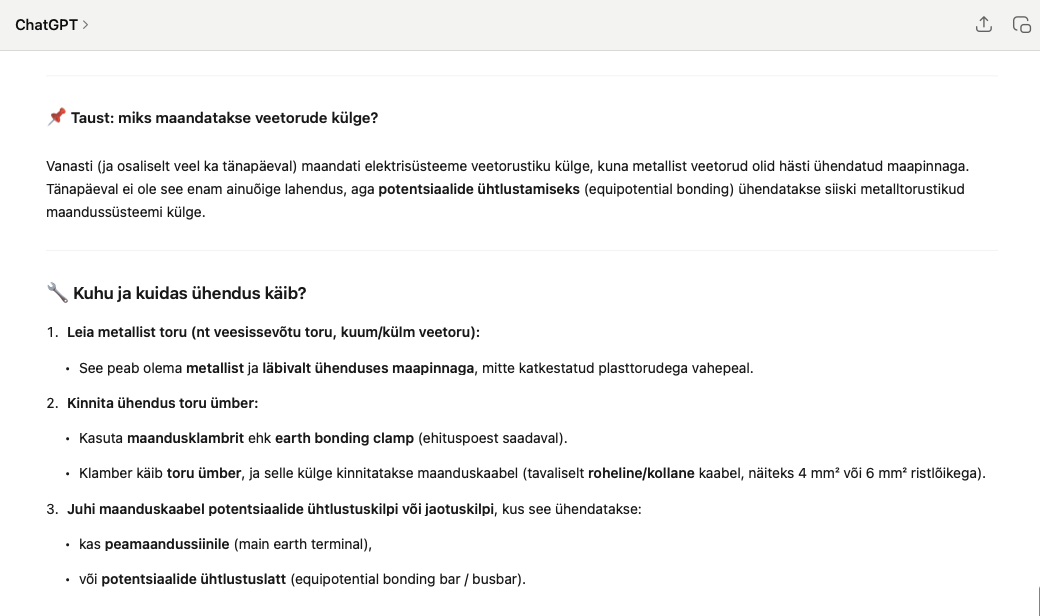 Chat GPT ütleb, et (panin screenshoti ka manusesse) juhi maanduskaabel potentsiaalide ühtlustuskilpi või jaotuskilpi; santehnik, kes kunagi teiselpool seina siu ühendas, räägib ka, et maandus peab kilpi minema. WTF, kus see kilp mul seal püstakus veel on? Ainult mingi juhe jookseb ülevalt alla. Või ongi see juhe kusagil mingisse kilpi ühendatud ja mina pean kuidagi selle juhtme nüüd endale kuhugi metalli külge ühendama? Igaljuhul -- reaalsus on sellel fotol, et mis seal seina taga toimub ja palun seletage nüüd rumalale inimesele, kuhu, mis kuramuse klambrid ma phendama pean? Need on ju plastiktorud! Oleks väga tänulik kui keegi saaks sellele mõõdikute fotole joonistada, et mida kuhu täpselt ühendama peab. Ülevalt jookseb üks rohekollane juhe, mis peakski tegelikult olema see mingi maandusjuhe, (ja mis arvatavasti siis ongi ka ehk kusagile kilpi juba ühendatud ehk. Selle pani kunagi remondi algul mingi elektrik...). Mis ma nüüd selle juhtmega teen? Ühendan veemõõdikute metalli külge vm? :D :D