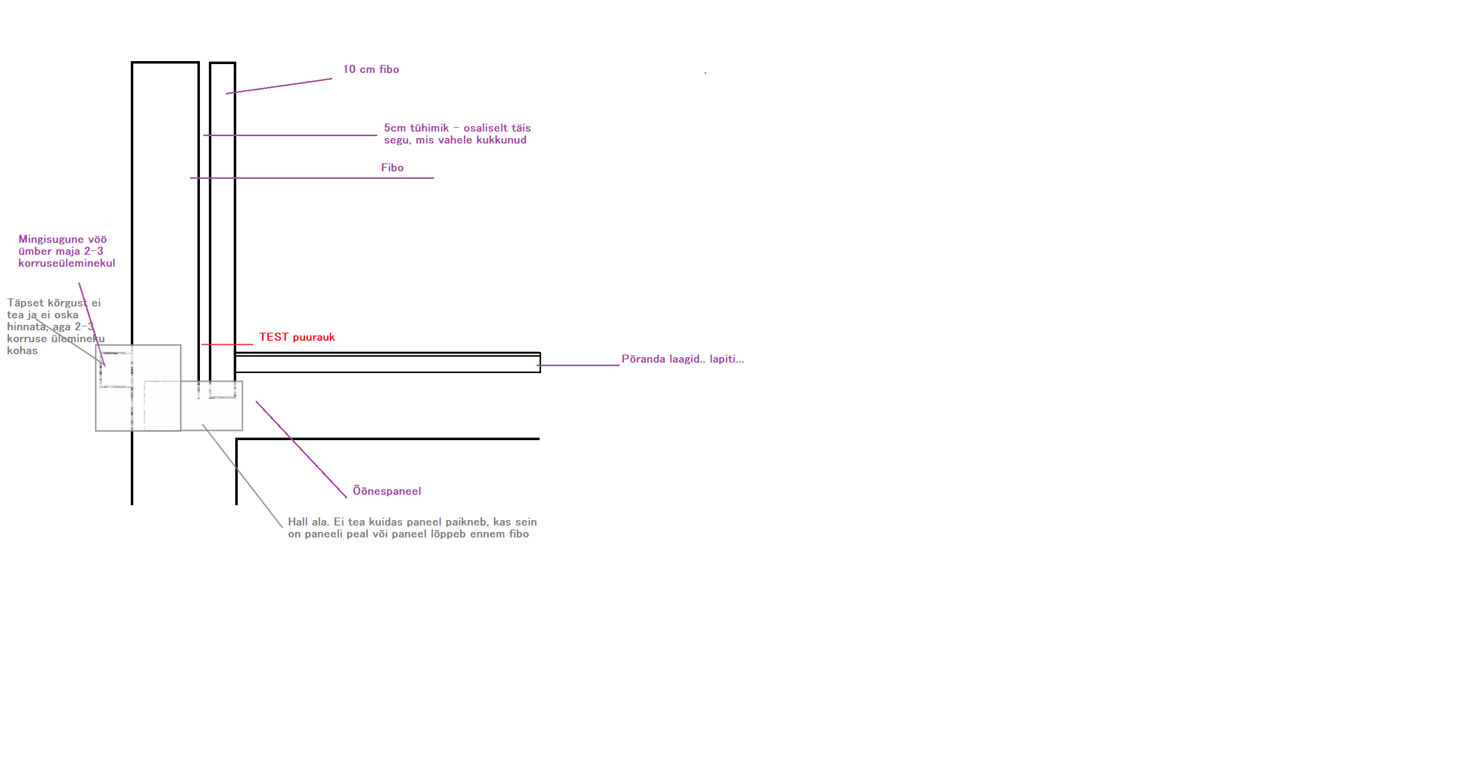 Puurisin prooviks põrandaliistu taha 10 cm vahedega kolm auku. Selgus, et välimise Fibo ja sisemise Fibo vahel on umbes 5 cm tühimik. Ilmselt on probleem ka õõnespaneeliga – see ulatub liiga kaugele välisseina poole või on täiesti soojustamata.