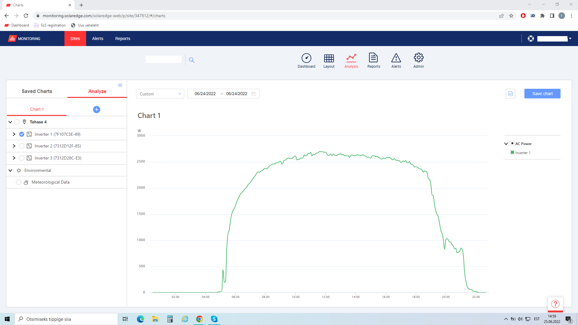 String 1: kõik paneelid 295W (tracker, working range 270° x 20°- 55°, õhtul peale 19:00 puud ees)