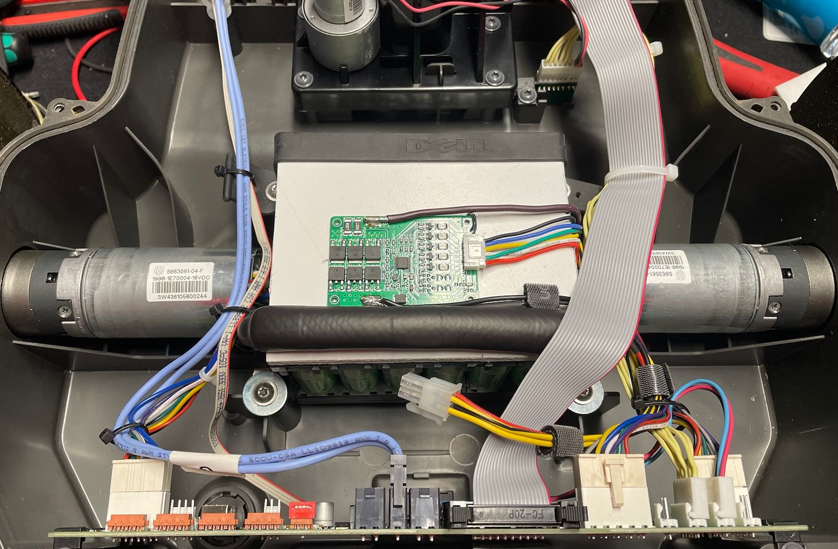Omaniku jutu järgi olla robotniiduk vajunud tiiki (polnud minu paigaldatud) ja nagu pildilt näha, BMS oli saanud niiskusekahjustuse. Pärast mitmete komponentide asendamist ja korrodeerunud kohtade ülejootmist ärkas too uuesti ellu.