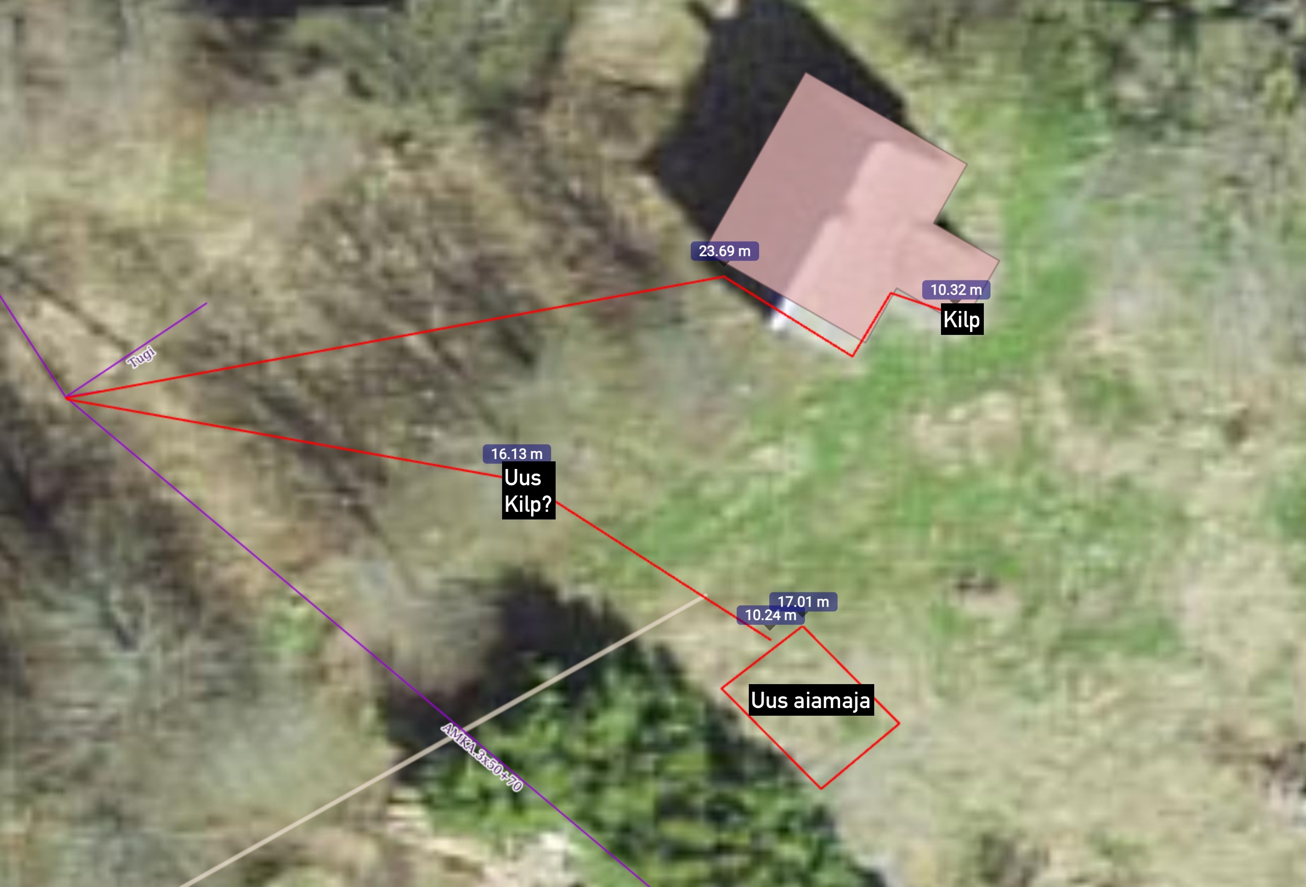 Pildil pole terve krunt, tegelik suurem hoov jääb pildilt välja paremale. Kuna elektrimast asub madalamal niiskel ja pehmel alal, kus kaevamisi jms teha üsna ebameeldiv, siis mõtlesin, et äkki oleks mõistlik kilp märgitud kohta paigaldada (sissesõidu tee kõrvale).