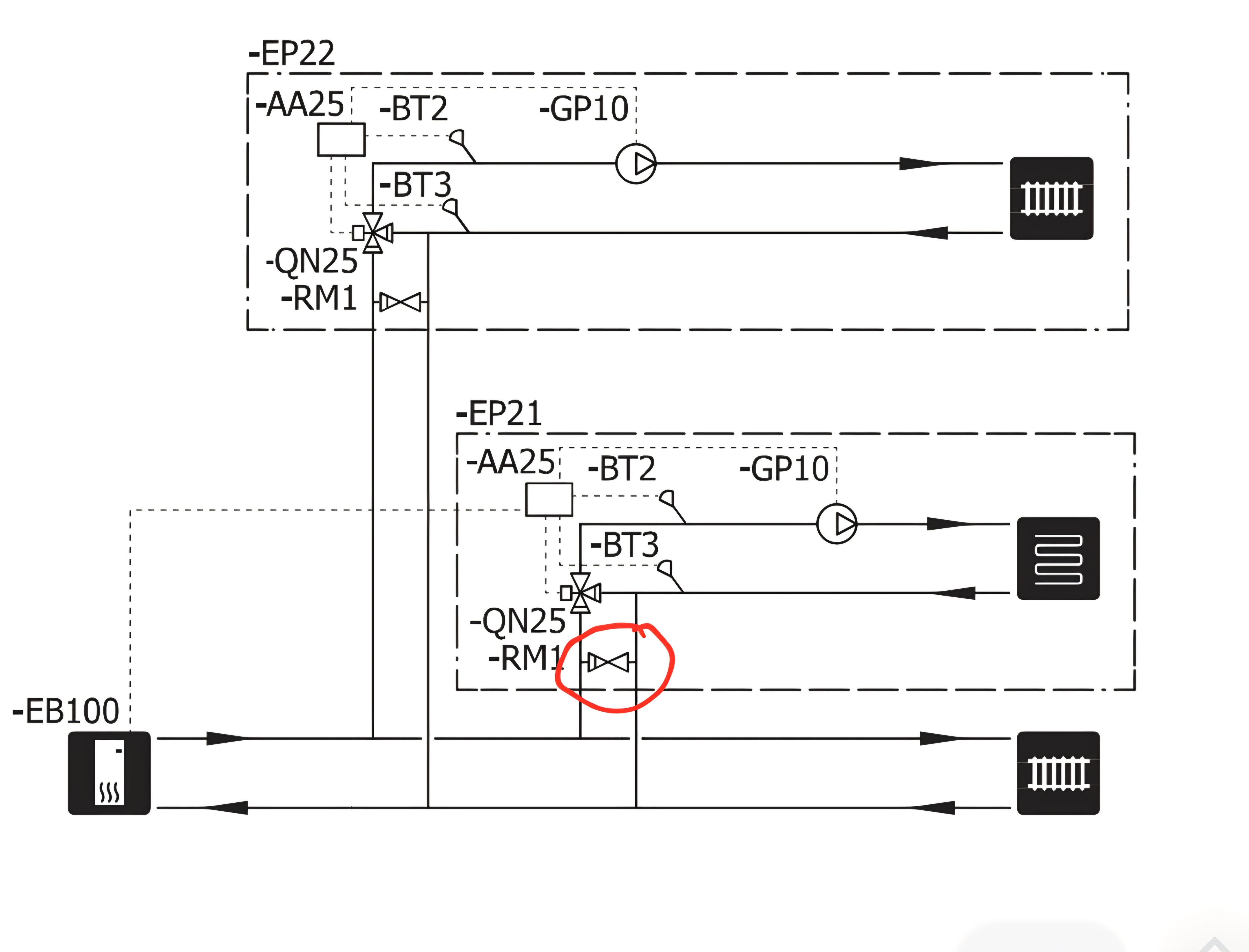 See klapp mis joonisel kaitseb soojuspumba ringluspumpa ja ka soojuspumpa olukorras kui kõik radiaatorite termostaadid on suletud ning küttevee rõhk pealejooksul peaks tõusma. Siis see ventiil RM1 avaneb ning laseb vee otse pealejooksult tagasijooksu torusse.