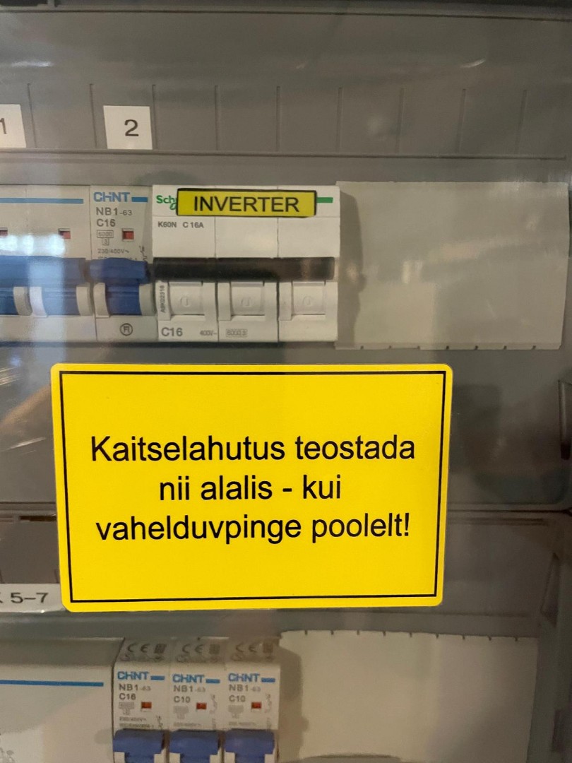 Täna oli vaja kaugujuhtimise teel juhendada koduperenaisi oma invertereid välja lülitama (Sofari saast pole distantsilt hallatav). Saatsid oma kilbiruumidest pilte ja mida nägin? Mitte ühelgi sildil pole kirjas, kust mida ja MILLISES JÄRJEKORRAS lülitada. Kilbi kaanel kaitselahutuse hüüdlause on täiesti jabur- pole üldse aru saadav, mida tuleb lahutada. Lihtsalt kantud kleebisele suvaline tekst ja asetatud kleebis suvalisse kohta.