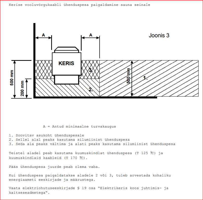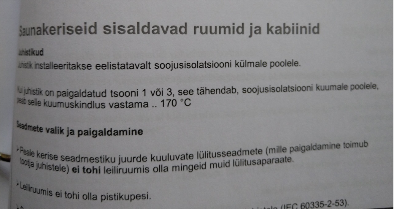 Kui juhe tuleb alt sisse, siis milline vajadus on seal kuumakindla järgi? Kas oled reaalselt elektrisaunas üldse käinud, seal midagi mõõtnud, vaadelnud? Jutt selline, et ei ole. Priiskamine kohas, kus pole vajadust, olevat ogarus.