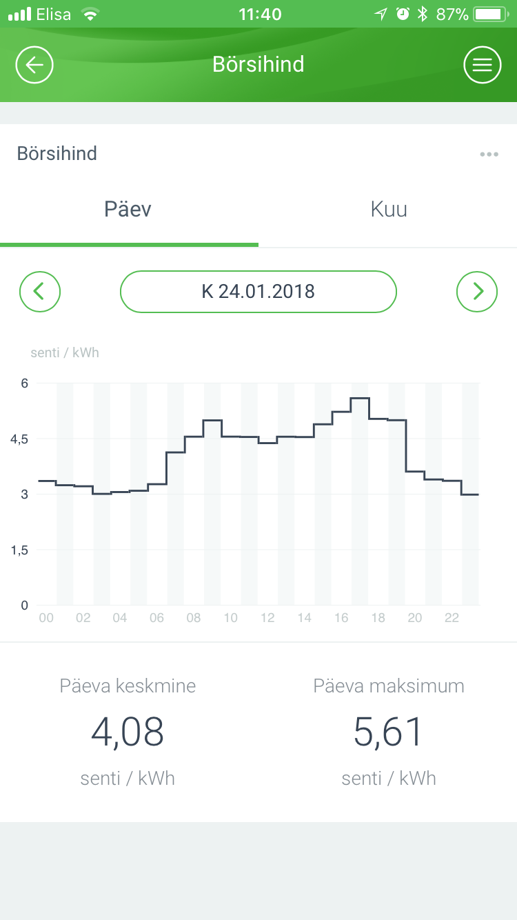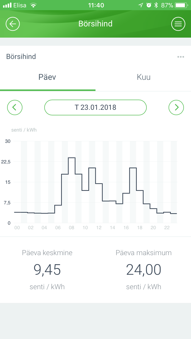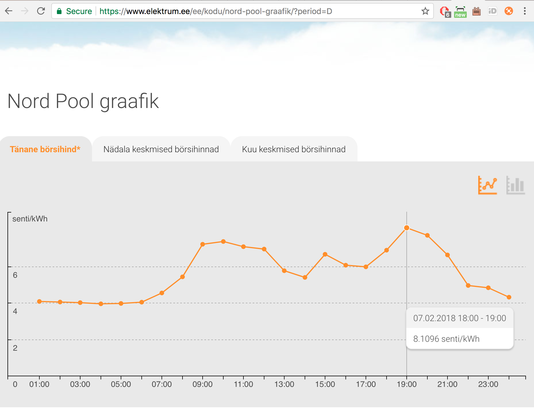 Kes sulle seda saadab ? EE ?Rein Sa kirjutas: 23 Jaan 2018, 11:35 ... Mul on börsihind kogu aeg ja kui hind ületab teatud piiri, siis tuleb meilile ja nutisse teade. Täna näiteks ongi niisugune imelik päev, kui kella 8 - 9 ajal oli KW/h hind 24 senti, see vist rekord, kui tavaline hind on sageli vaid 3 senti. Kummaline jah, et nii suured vahed ?
