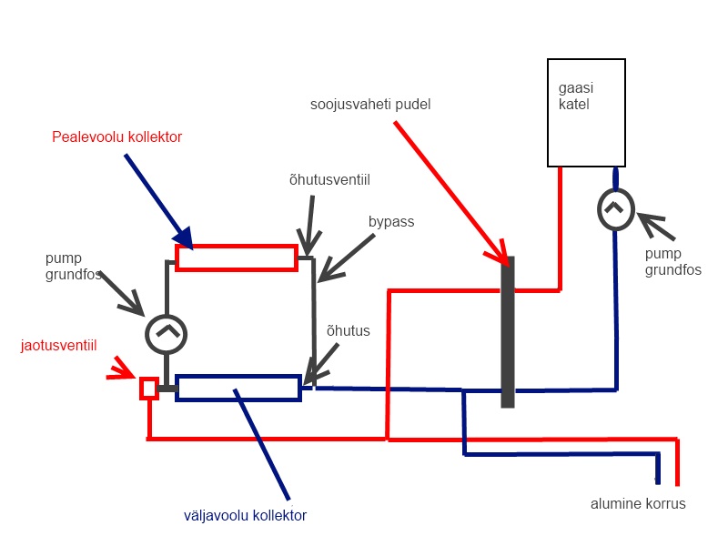 Kollektorisse jookseb 25mm alupex ja välja tuleb ka 25mm alupex. Kontuuridesse jookseb 20mm alupex. Pumbad on grundfosi omad, kõik 3 (katel ja kollektorid).