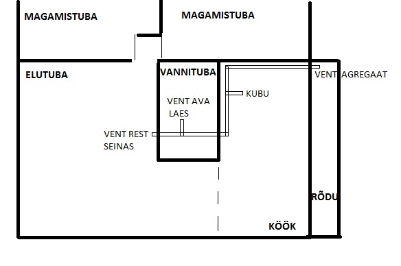 Vaja lahendada 3toal korteri ventilatsioon remondi käigus. Mõte on olemasolev peenikeste kanalitega ventkorsten kasutamata jätta ja paigaldada vent agregaat rõdule. Sealt tooks toru sisse ja köögi lae nurgast kubusse, sealt edasi läbi seina vannitoa lae peale ja viimaks läbi vannitoa vaneseina paneks ventresti ka elutuppa.