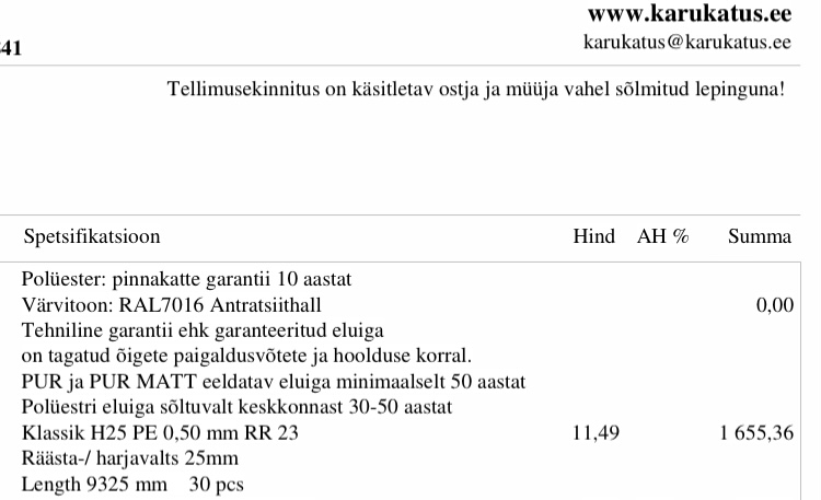 Kaasa saame anda pildi ostudokumentidest, et oleks näha ka vajaminevad kinnitustarvikud, kogused jne. Vajadusel saab Karu Katus paanid lühemaks lõigata.