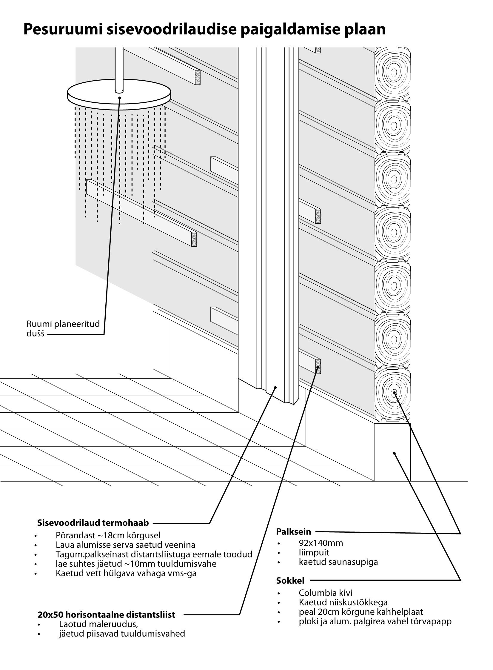 Ise plaanisin pesuruumis palgile siiski voodrilaua panna AGA - vertikaalvoodrilaud oleks põrandapinnast ~18cm kõrgusel, põrandad on el.köetavad, korraliku niiskustõkkega ja 20cm ulatuses seinale ulatuva kahhelplaadiga. (Palkseinad on ehitatud kogu hoone ulatuses Columbia plokist soklile), ruumis on ette nähtud nii loomulik vent kui sundvent ja pinnad kaetud veekindla kihiga. KAS SELLISEL JUHUL (vt. pilti "pesuruum") MÄRGRUUMIDE EHITUS TÖÖTAKS?
