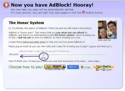 See Chrome'i vidin "AdBlock" täiesti toimib ja on paigaldatav ka tasuta (loe ilma rahalise toetuseta antud progammi loojale). Selleks et antud vidin tasuta paigaldada tuleb pärast installimist avanevas aknas annetuse summat tähistav märk liigutada vasakule 0$ peale, siis peaks avanema uus pilt...