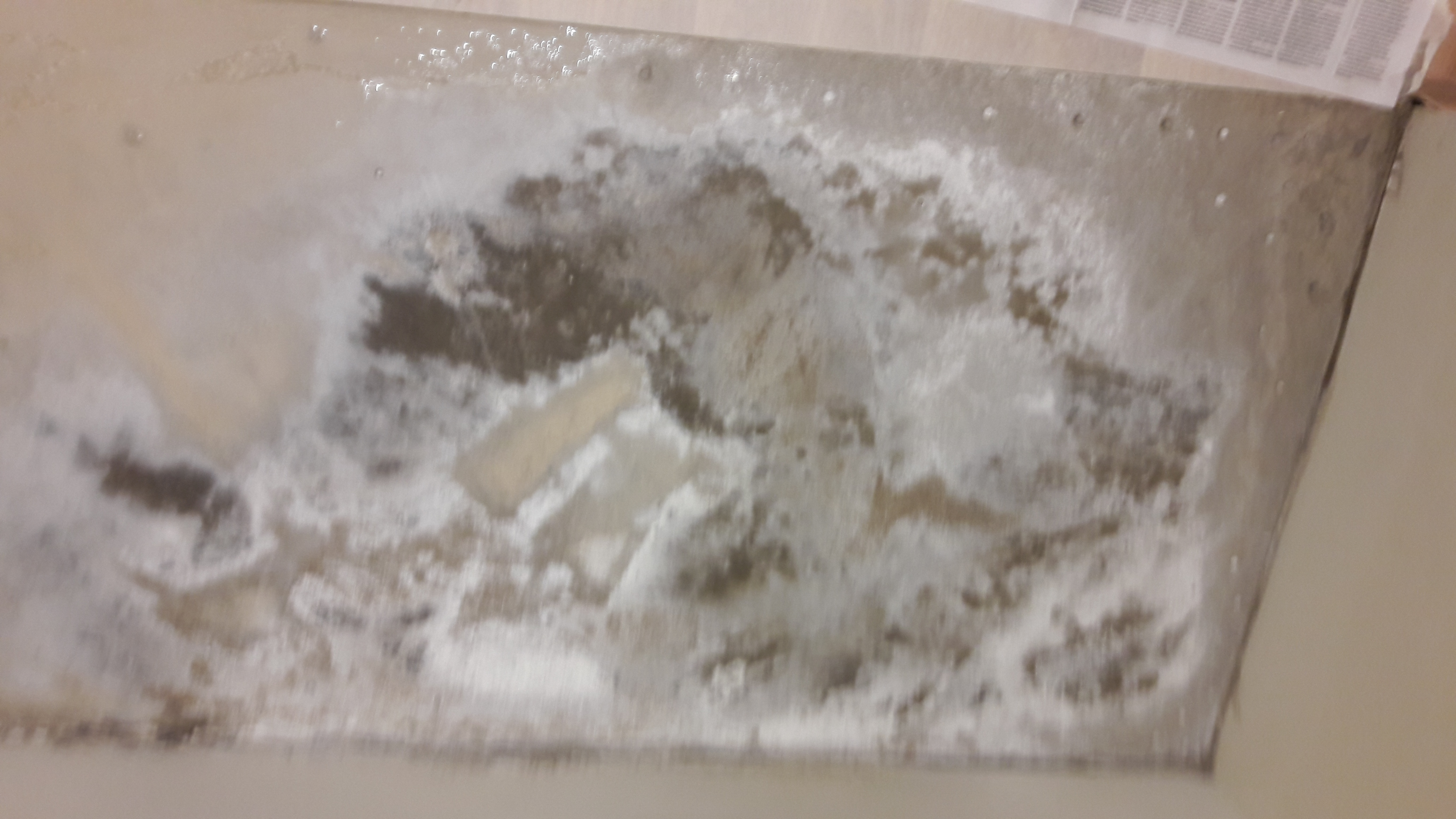 Vesi kuivatati sama päeval (eile) ära, täna näeb pind välja nii nagu näitab pilt 2 (ühel pool valge jahune kiht + künkad + niiskuslaigud, teisel pool mingi liimjas siledam kiht niiskuslaikudega).