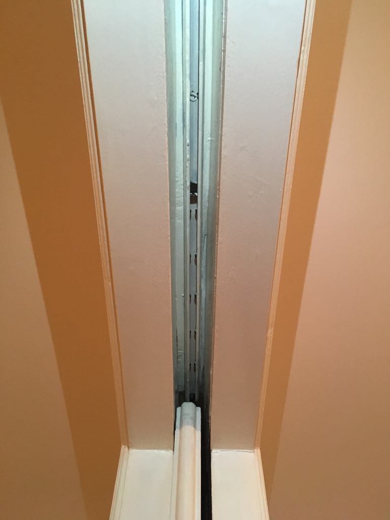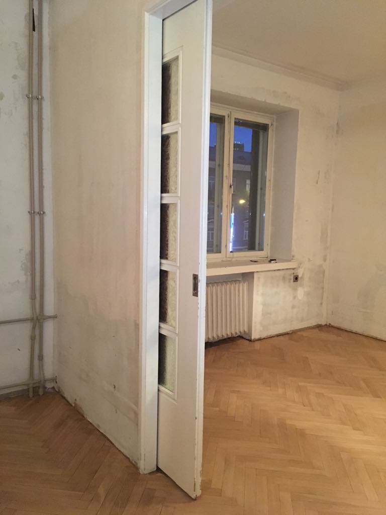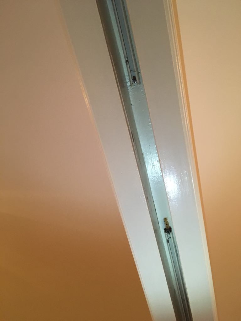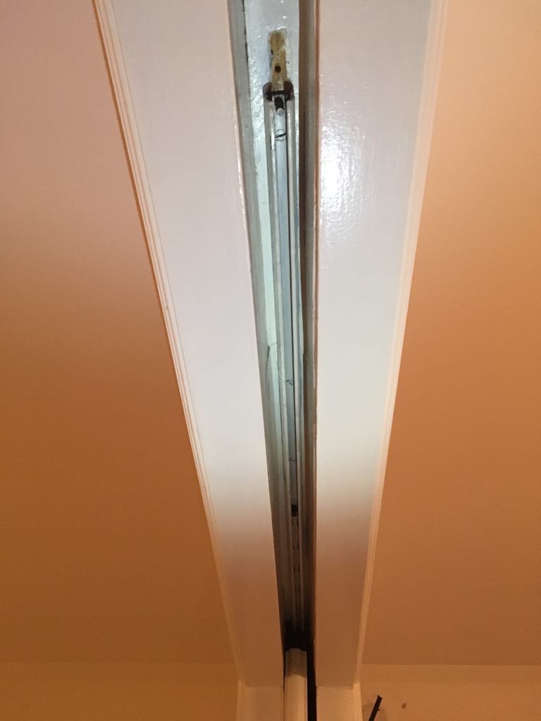 Esimene instink oli, et uksi kergitades saab nad kandurite pealt maha tõsta, kuid see ei osutunud õigeks. Redeli pealt piiludes tundus ka, et ülemised kandurid on mutritega kinnitatud (saaks küljelt küljele sättida, kui uks maas või kui sein maha lõhkuda). Teiseks tundus kohe, et kui eemaldada siini otstes olevad stopperid saab uksed ükshaaval siini seest välja libistada. Stopperiter on lapikkruvikeeraja pilud, kuid need käivad lihtsalt ringi, mitte ei ole keermega puidu ega siini sees. Eemaldasin esimesed kolm kruvi, mis siini kinni hoiavad ja sain selliselt näpuga siini alt katsuda, mis seal toimub. Tundub nagu stopper oleks mehhaaniliselt siini külge lukustatud nagu neet vms. Võimalik, et stopper ise on pime mutter ja ülevalpool peitpeaga polt, kuid seda kuidagi kinni hoida ei õnnestu. Tervet siini eemaldada ei saa, kuna see on seina sees ja uks ise jääb ette.