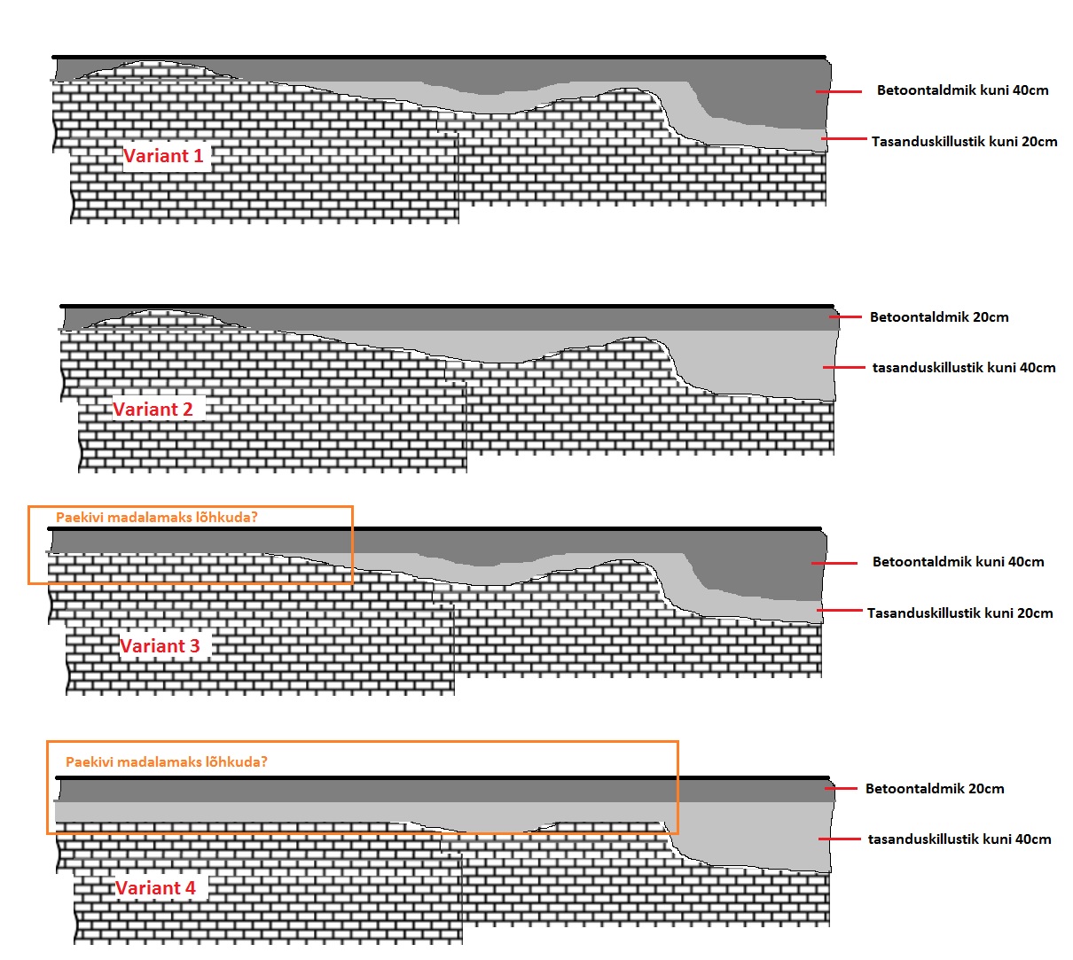 Paluks arvamusi, milline neist variantidest oleks kõige loogilisem viis ebatasasele paekivile lintvundamendi taldmiku rajamiseks.