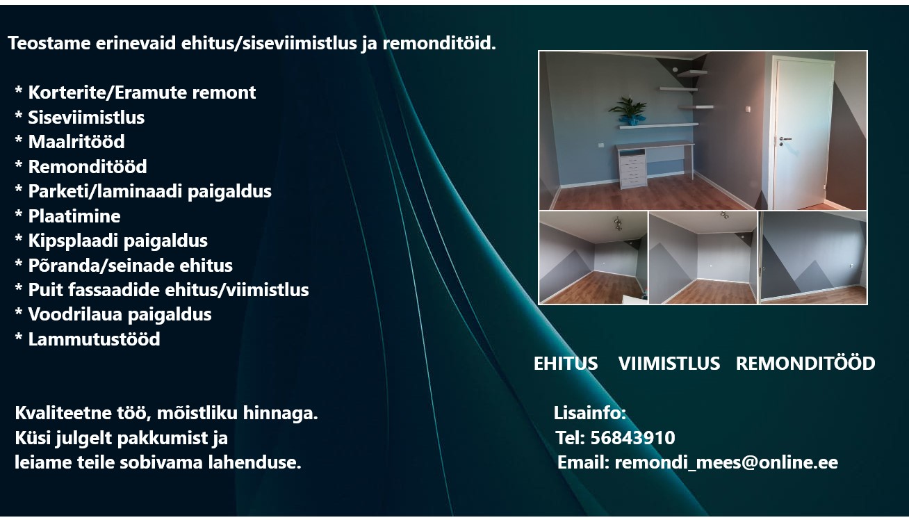 Teostame erinevaid ehitus viimistlus ja remonditöid teie korterites/eramutes,põhi töödeks mida teostame on puidutööd,väiksemate kuuride ehitus,puitfassaadid,laudise paigaldus,tuulekastide ehitus,põranda/veheseinade ehitus,korterite/eramute remonditööd,kipsitööd,siseuste paigaldus,parketi/laminaadi paigaldus,pahteldamine,värvimine,kruntimine,tapeetimine,plaatimine,lammutustööd jms tööd.Küsi julgelt pakkumist ja leiame teile sobivama lahenduse.
