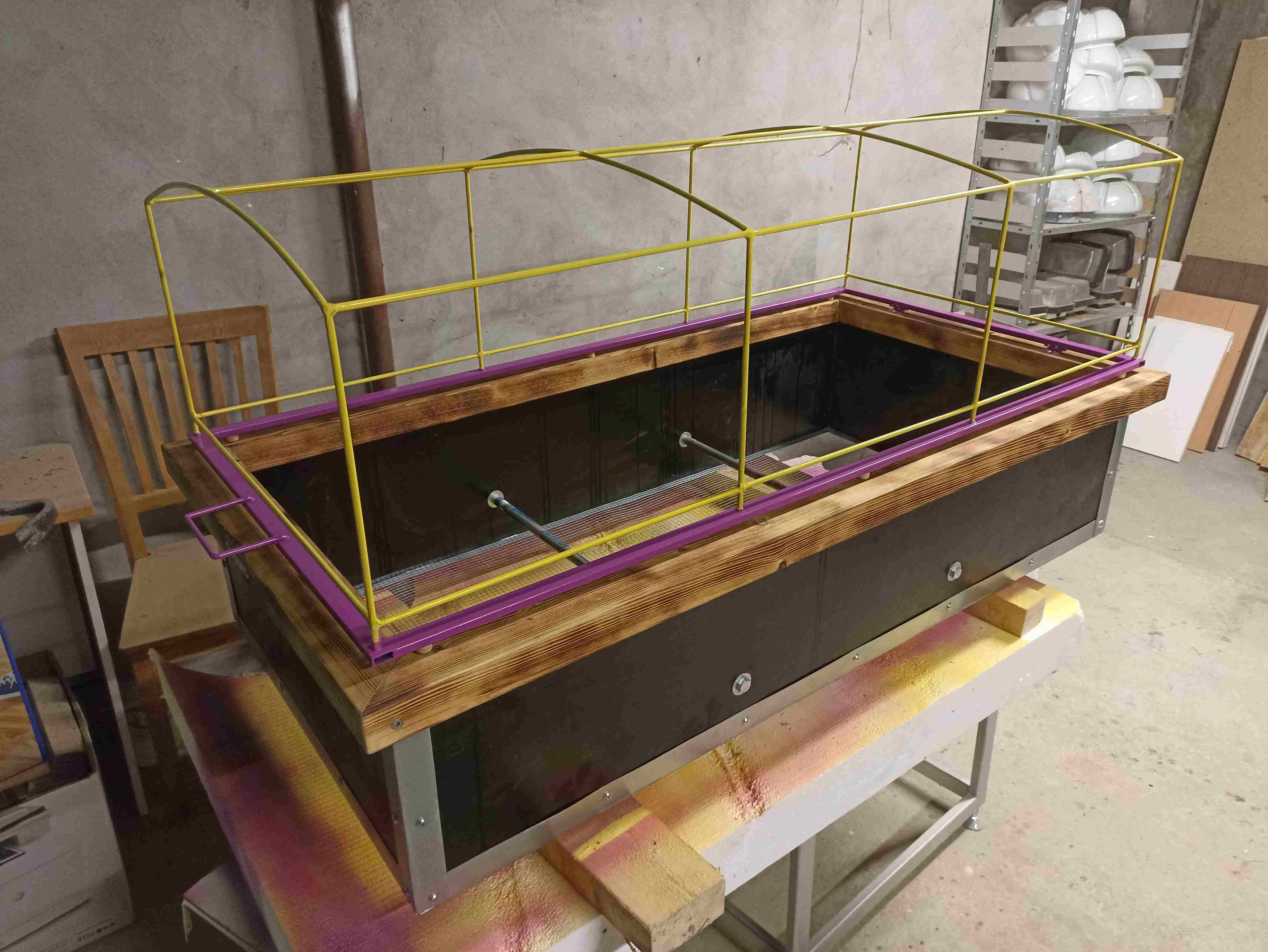 Kirjeldan veidi omatehtut ja äkki kellegi direktor tahab sarnast. ;) Kasti mõõtmed on sentimeetrites 125x65x25. Põhja klammerdasin hiirevõrgu, sest maal vesirotid sigatsevad piisavalt, sealhulgas söövad ka maasikate juurikaid. Prototüübil sissepoole on veel klammerdamata geotekstiil. Pasakate(erinevat liiki rästaste) rüüsteretkede vältimiseks tegin peale raami. Alusraam(pildil lillat värvi) on 10x20x1,5mm nelikattorust. Sellest tulevad välja servadest kumbaltki poolt neli 30cm kõrgused ja pealt kergelt kaarjas karkass võrgu kinnitamiseks on 6mm ümarrauast(pildil kollast värvi). Kuna kahtlustasin, et selline hunnik niisket mulda võib hakata deformeerima kasti pikemat külge, siis selleks leidsin oma arvates lahenduse. "Aaretekonteinerisse" oli keegi ära visanud hulgim alumiiniumist suusakeppe, siis ma teadsin, et leian neile kunagi kasutusotstarbe ja saingi neid nüüd kasutada. kasutusotstarbe leidin maasikakastide raami stabiliseerimise näol. Kastis fikseerimiseks oli vaja vaid parajaks mõõdetud suusakepi otsast sisse pista 10mm ümar jätkumutter ja see neediga fikseerida. Kasti peale tegin 45x145x300mm prussist raami, mille muidugi lasin kõigepealt pikuti pooleks. Kuna olen veidi üle poole oma tööinimese elust töötanud siseviimistlejana, siis pidi ka maasikakast olema dekoratiivne. Põletasin leeklambiga ära ja töötlesin esialgu parafiinõliga 1x. Kuna kasti materjali paksus oli 18mm, siis lasin iluraamile tagantpoolt freesiga 20mm laiuse freesiga ca 8mm sügavuse soone. Peale seda lõikasin nurgad 45* nurga alla ja oleks "nagu tädile". ;) Kasti allapoole jääv serv sai samuti paksult parafiinõliga kokku määritud. Vist eelmiste postituste soovituste põhjal kruvisin servadesse plekkvinklid. Kuna maal käib kastmine õhtuti, siis vihmutusvee valgumisest filmi jooksma pannes sain aru, et vesi voolab vabalt ka vinkli vahelt alla. Selle mädandamise probleemi vähendamiseks, et vesi ei valguks alla kasti saetud serva pinnale, lasin vinkli siseküljele siru silikooni ja siis kruvisin liistu kasti külge.
