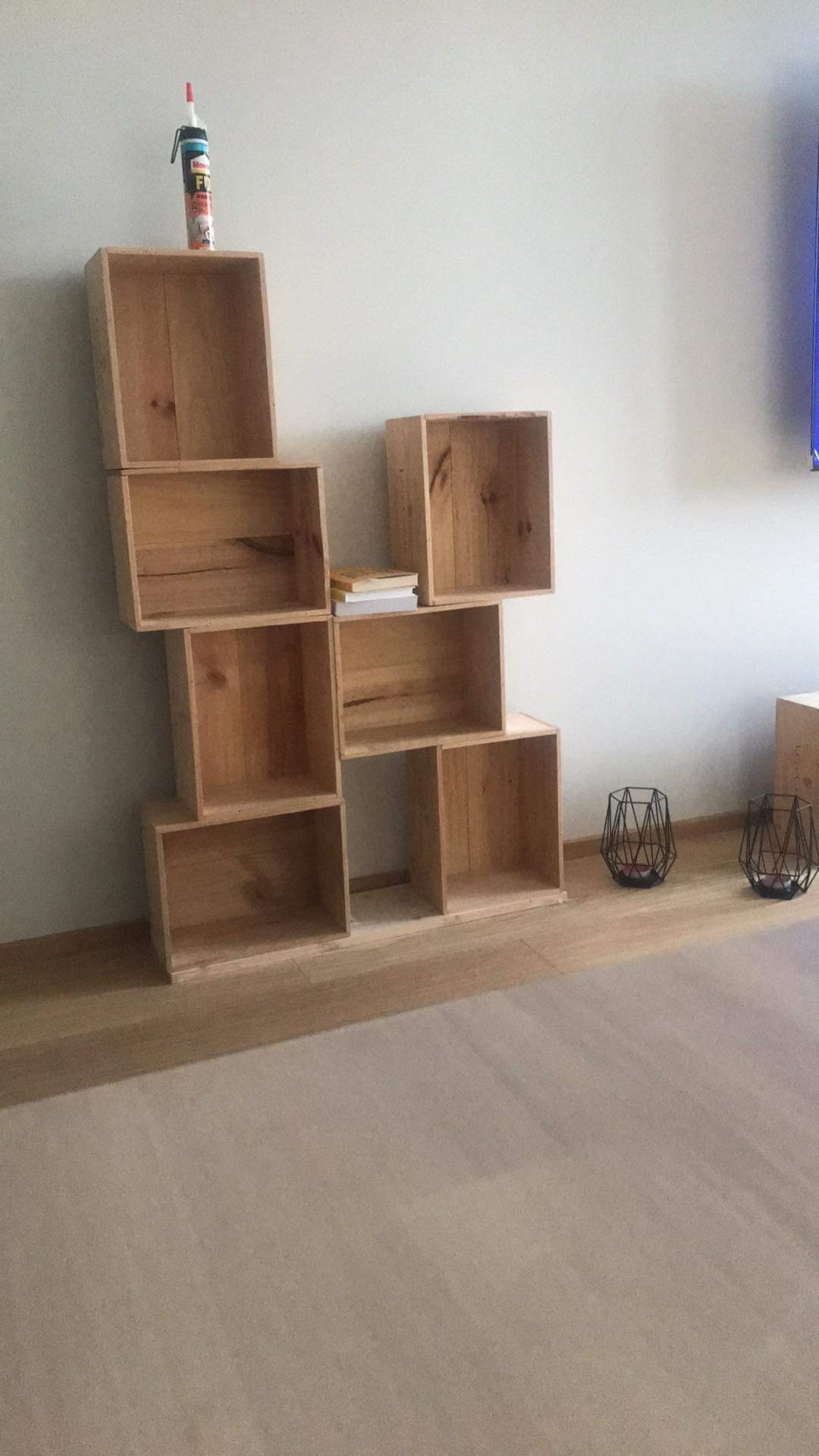 Kui see riiul jääb statsionaarseks ehk ei muuda kastide asukohti, siis visuaalselt silmapaistmatumaks jäävad vist liim ja puidust tüüblid, aga ise vist keeraks ikkagi kruvidega omavahel kokku. Kruvid laseks vist altpoolt üles, siis ei jäävad kruvikohad ka pikemal inimesel riiulisse kiikamisel märkamata. Ja alumisel riiulil kruvikoha puuriks ette.