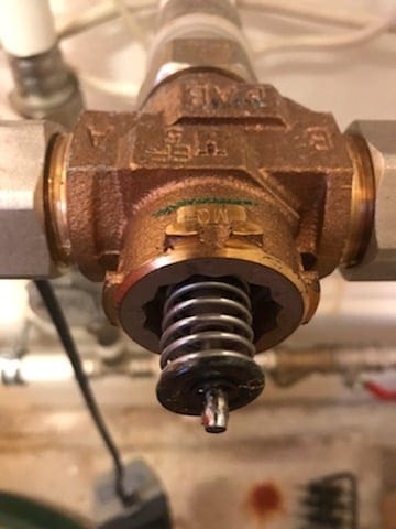 Ilmselt on sul seal Honeywelli ajamiga 3-tee ventiil (lisasin pildi)? Tarbevee kütmiseks surub ajam pulga alla, kütteringile tagasi minekuks peab ventiil vedru jõuga tagastuma. Mina olen oma pumbal kaks korda seda 7 aasta jooksul vahetama pidanud, sest on kinni kiilunud. Esimene kord vahetasin terve ventiili koos korpusega aga teine kord taipasin, et saab vahetada ka ainult sisu (ja seda saab osta näiteks Citykliimast, neil kohapeal olemas)