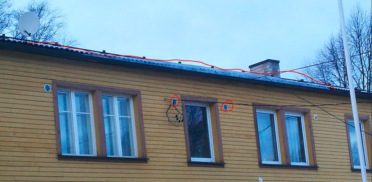 Tuulutuseks 48x48. Soe ei tuuldu välja kui palju lund. Peaks olema tuulutusroov 70x70 ja hakkidega. Nad tegid siis harja peale tuulutuse, väga spets profiiliga harjaplekk. Servad läksid muru alla. Iga ca 4m tagant oli korsten.