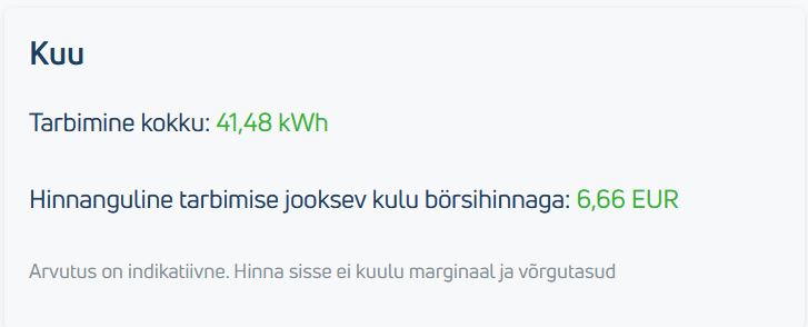 Börsipaketti kasutades peab olema valmis, et sellega võib suurema tarbimise puhul ühe päevaga 35eur ülemaksta.kunn24 kirjutas: 05 Veebr 2023, 00:49 Jaanuari arves oli UT-ga elektrihind 103,5 (arvutasin KM-i juurde vastavale arvereale) ja Tarbmisajaloos EE veebis näitas börsihinnaga 68,18 € koos KM-ga. Seega UT-ga sain pügada 35 € koos KM-ga.