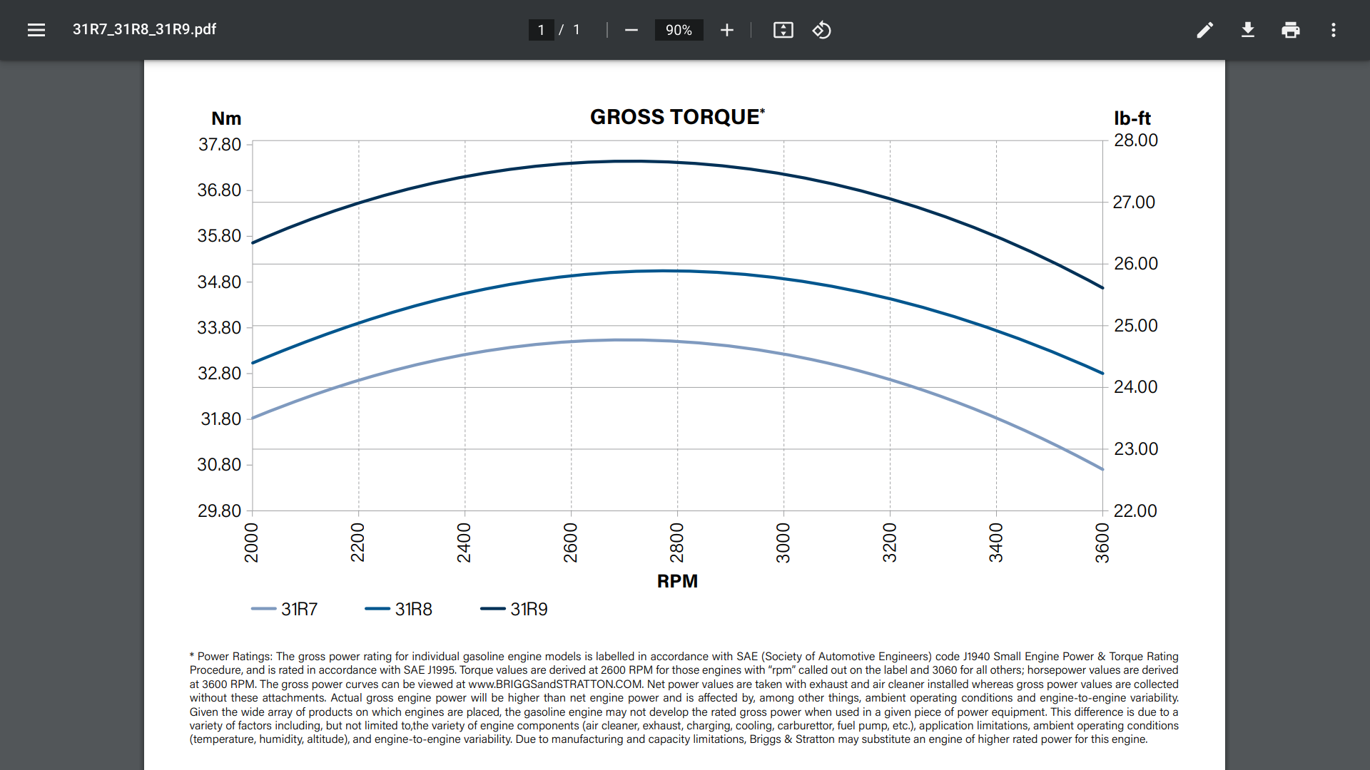 Individuaalsete bensiinimootorite mudelite brutovõimsus on märgistatud vastavalt SAE (Society of Automotive Engineers) koodile J1940 Small Engine Power & Torque Rating Procedure ning see on hinnatud vastavalt standardile SAE J1995. Pöördemomendi väärtused on tuletatud pööretel 2600 p/min nende mootorite puhul, mille sildil on märgitud "rpm" ja kõigi teiste puhul 3060 pööret minutis; hobujõu väärtused on tuletatud 3600 p/min juures. Koguvõimsuse kõveraid saab vaadata aadressil www.BRIGGSandSTRATTON.COM. Puhasvõimsuse väärtused võetakse paigaldatud väljalaske- ja õhupuhastiga, samas kui koguvõimsuse väärtused kogutakse ilma nende lisadeta.