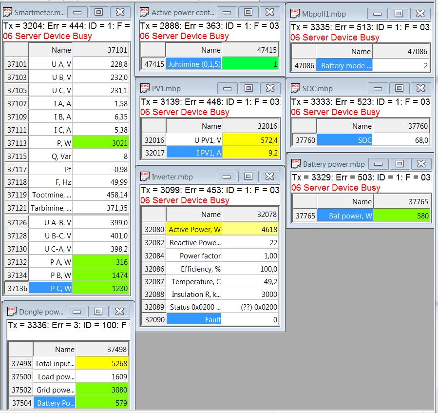 Juhtimise aknast saab anda käske võimsuse muutmiseks (max võimsus, Zero export). On ühendatud inverteriga üle Modbus-TCP. Miskipärast inverter annab suht palju Time out erroreid (kanalist ID=1), ju on H-l midagi valesti (kanalist ID=100 on kõik ok). Aga asi siiski toimib.