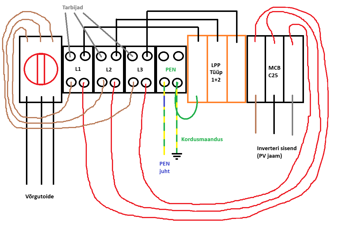 Tahaks omale peale PV jaama paigaldust inspektori kutsuda, kes el-paigaldise oma täies hiilguses auditeeriks, aga tegin kilbis ühe põhimõttelise muudatuse, mis äkki ei ole lubatud. Nimelt paigaldasin kilpi igale sisenevale faasile hargmiku (hargmikul 4 klemmi: võrgutoide, inverteri toide, liigpingepiirik, pealüliti sisend), võib-olla paigaldasin hargmikud valesti, kuna kilbi PEALÜLITI ei ole enam PEALÜLITI, see on nüüd hoopis MAJA lüliti, mis lahutab võrgust maja tarbijad, aga päikesejaam jääb PEALÜLITI väljalülitamisel ikka võrguga ühendatuks - päikesejaama lahutamiseks tuleks välja lülitada päikesejaama 3P25 automaat. Kas selline lahendus on aktsepteeritav või täielik ämber ja peaks võrgutoite otsad ikka pealüliti klemmidele tagasi ühendama?
