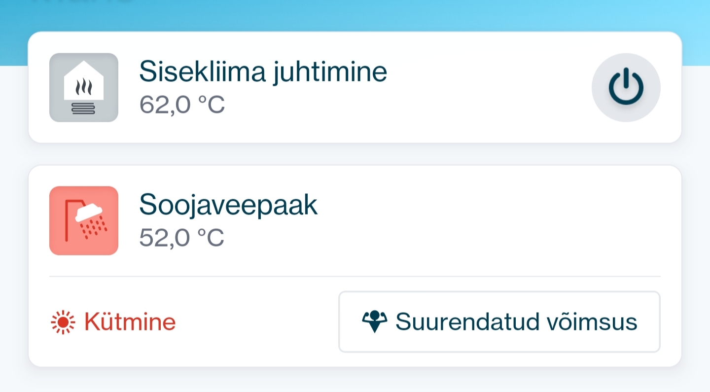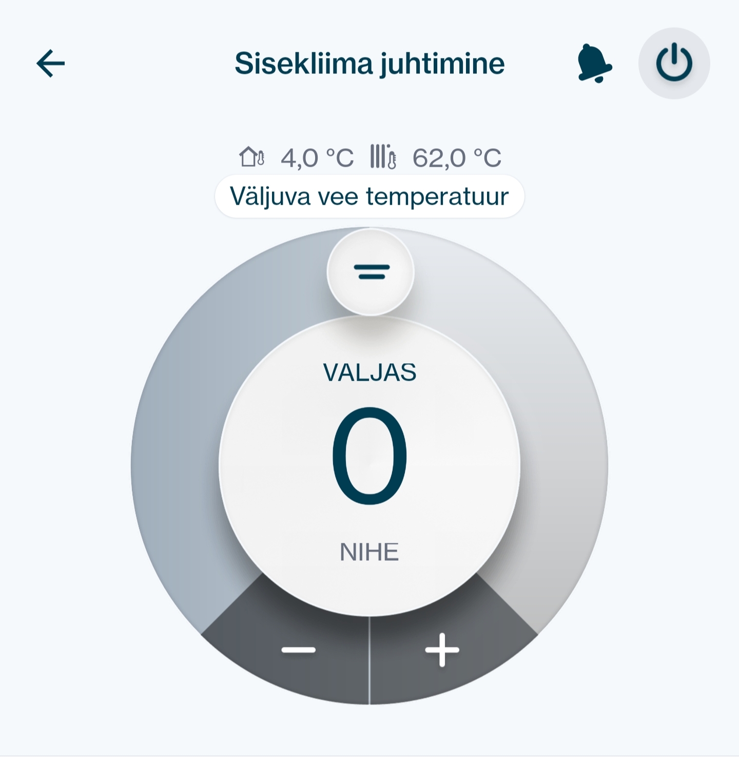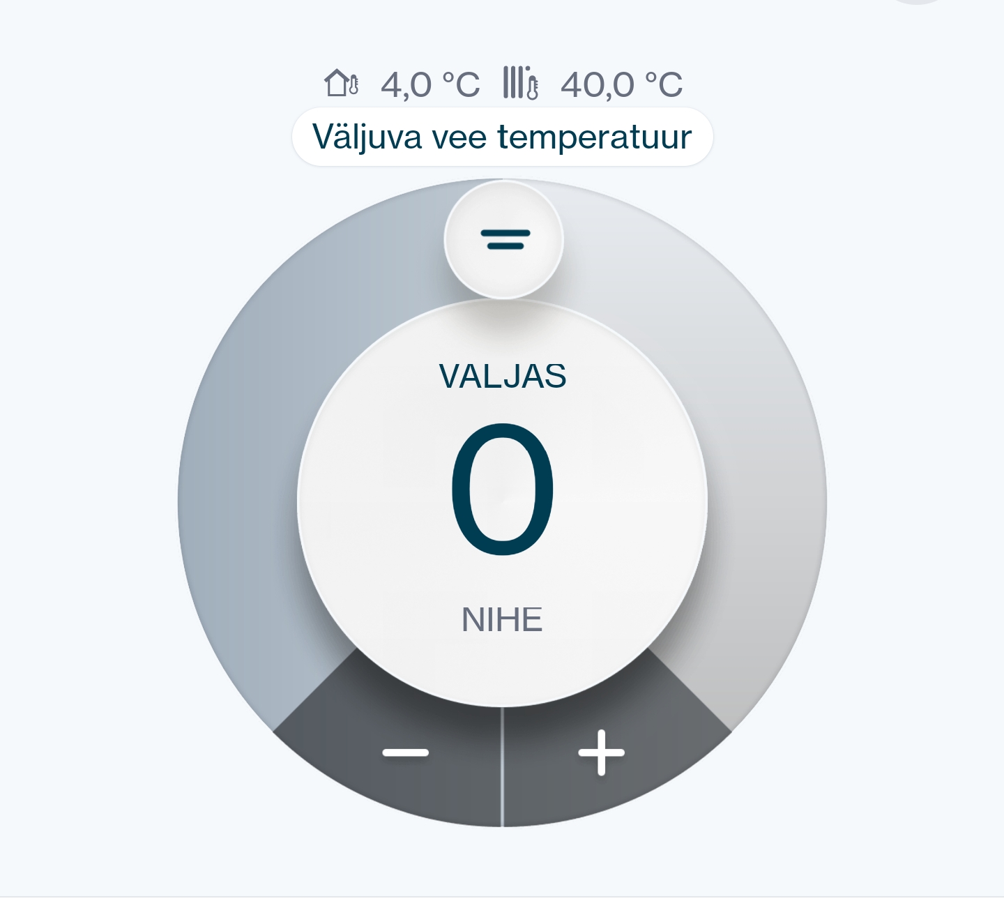Aga mu mure algas sellest, et nihet miinusesse keerates on see vee näit kuumem kui äpist väljalülitatud olekus ja null nihke puhul veelgi kuumem. Tahaks, et nihke null oleks seal, kus praegu äpis näitab, kui sisekliima juhtimise välja lülitan. Muus osas olen rahul praeguse pumba kalde või graafikuga või mis ta on, mis ilma kõikumisest lähtub. Aga äpi nihe on nihkes :blink: Kust poolt seda nihutama peaks, seadme küljes?