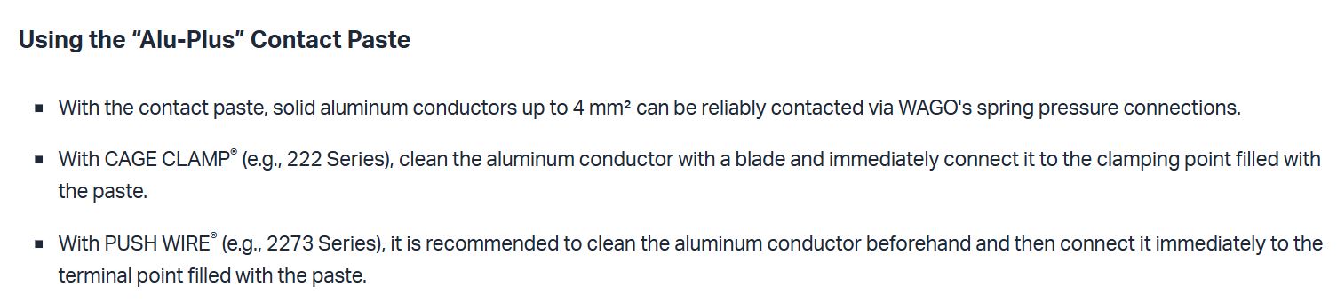 Üldse kasutab WAGO selles jutus ladina keele lühendit "e.g." (exempli gratia), mis tõlkes tähendab "näiteks". Tundub, et loetelu on lahtine ja piirangud on vaid osas, et tuleb Al juhi puhul ta määrdega kokku teha või täpsemalt, määret tuleb enne juhi auku toppimist pigistada auku.