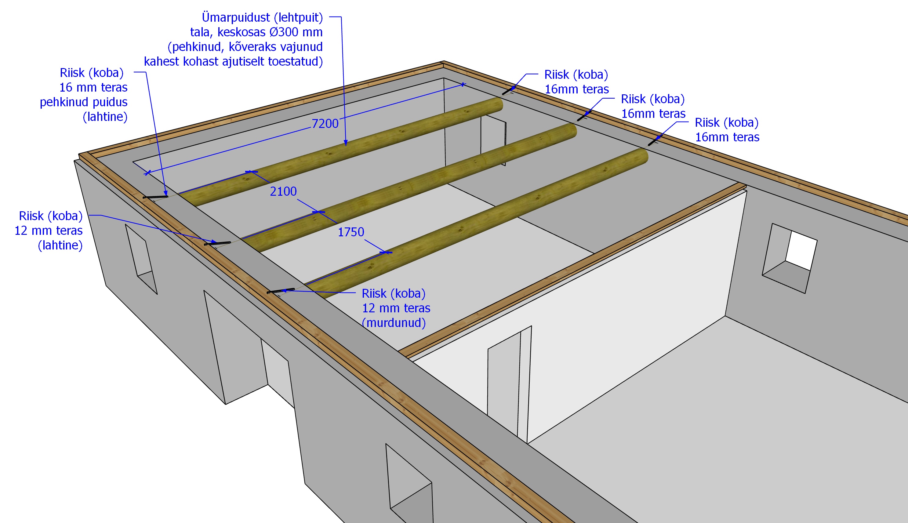 Kuna vanad ümarpuidust keskosast 30 cm läbimõõduga talad on müüritud müüride sisse (müüri ülemise pinnaga tasa), siis uue lae saaks toetada müüri peale olemasoleva lae kohale.