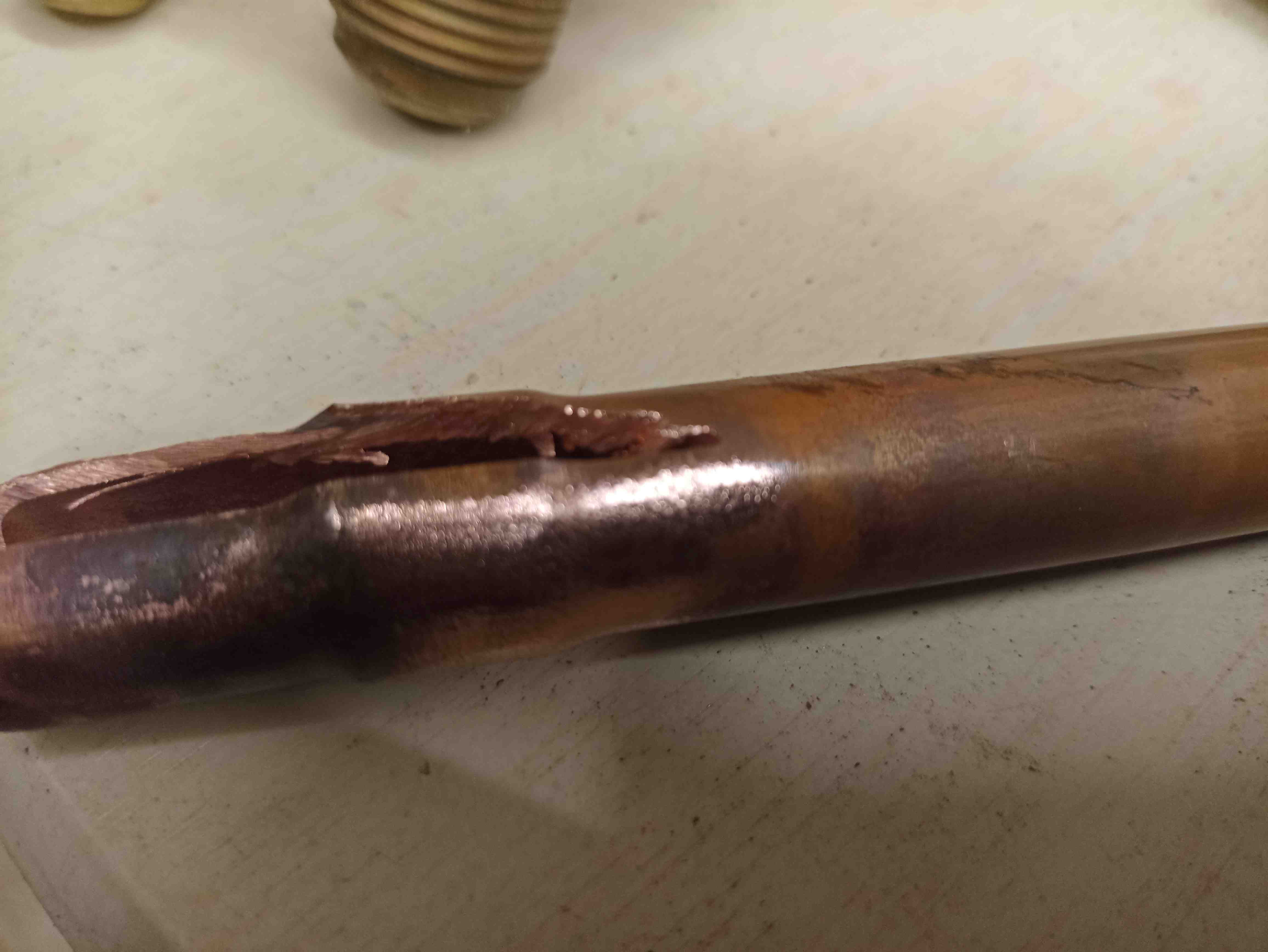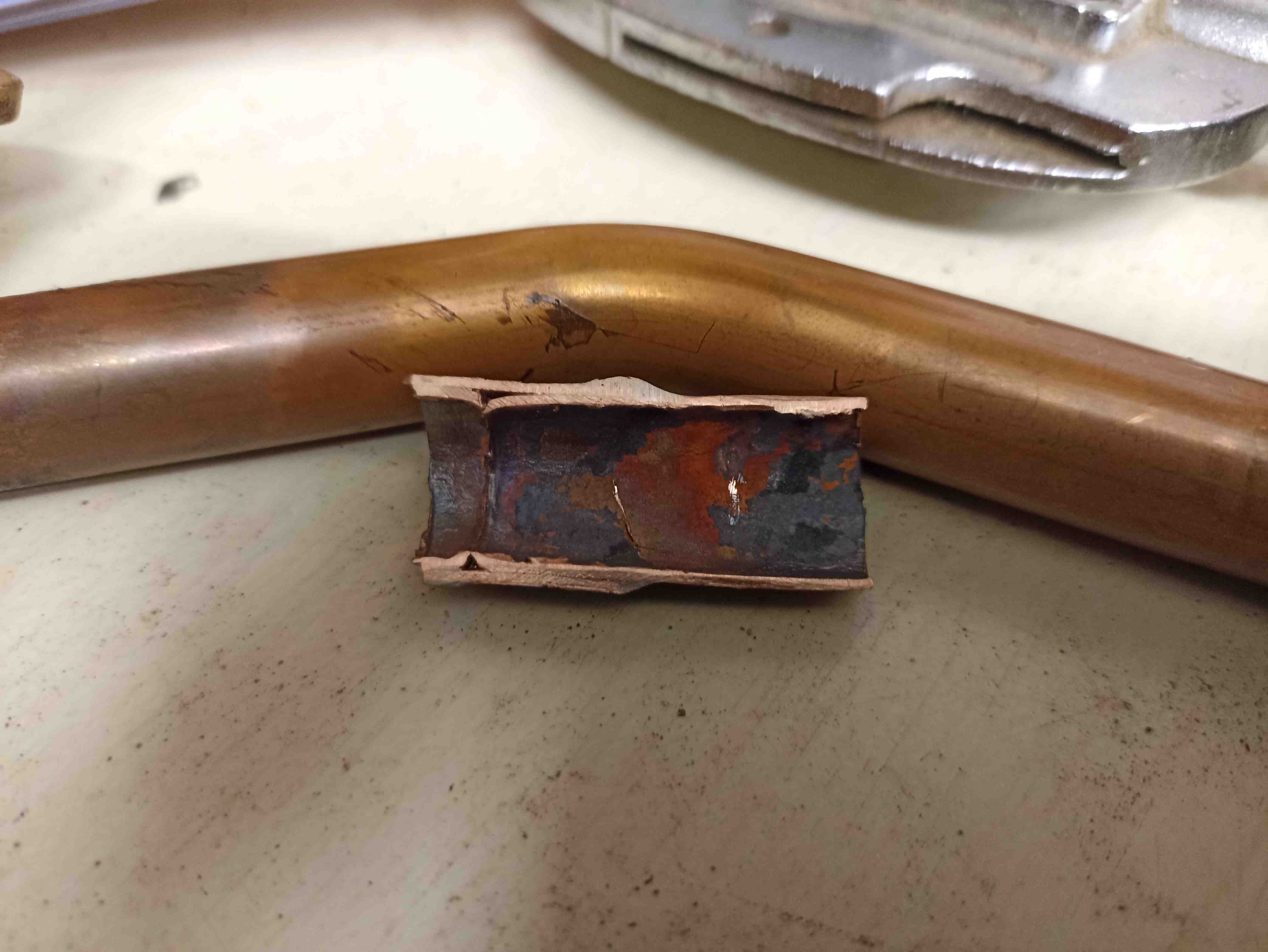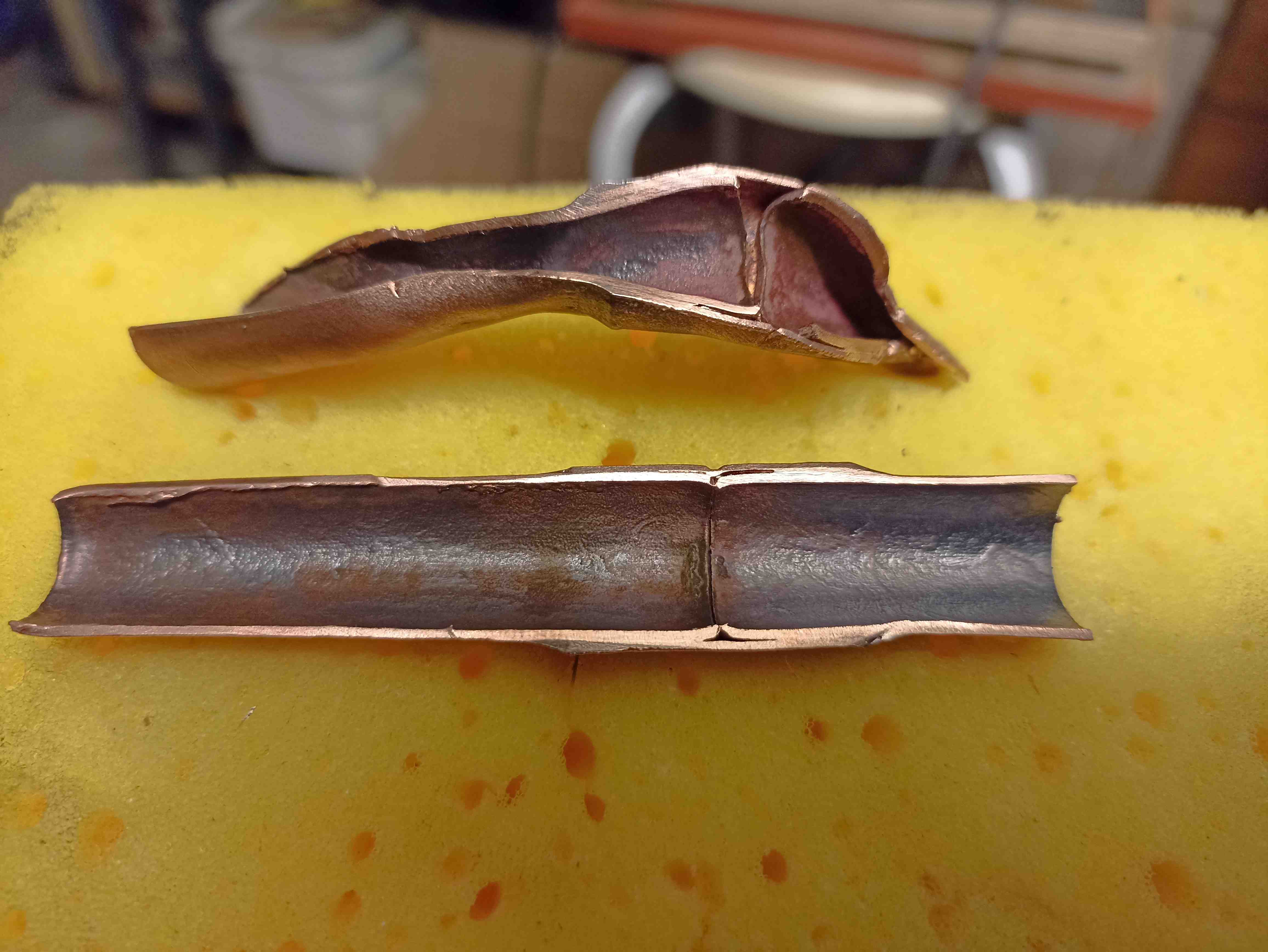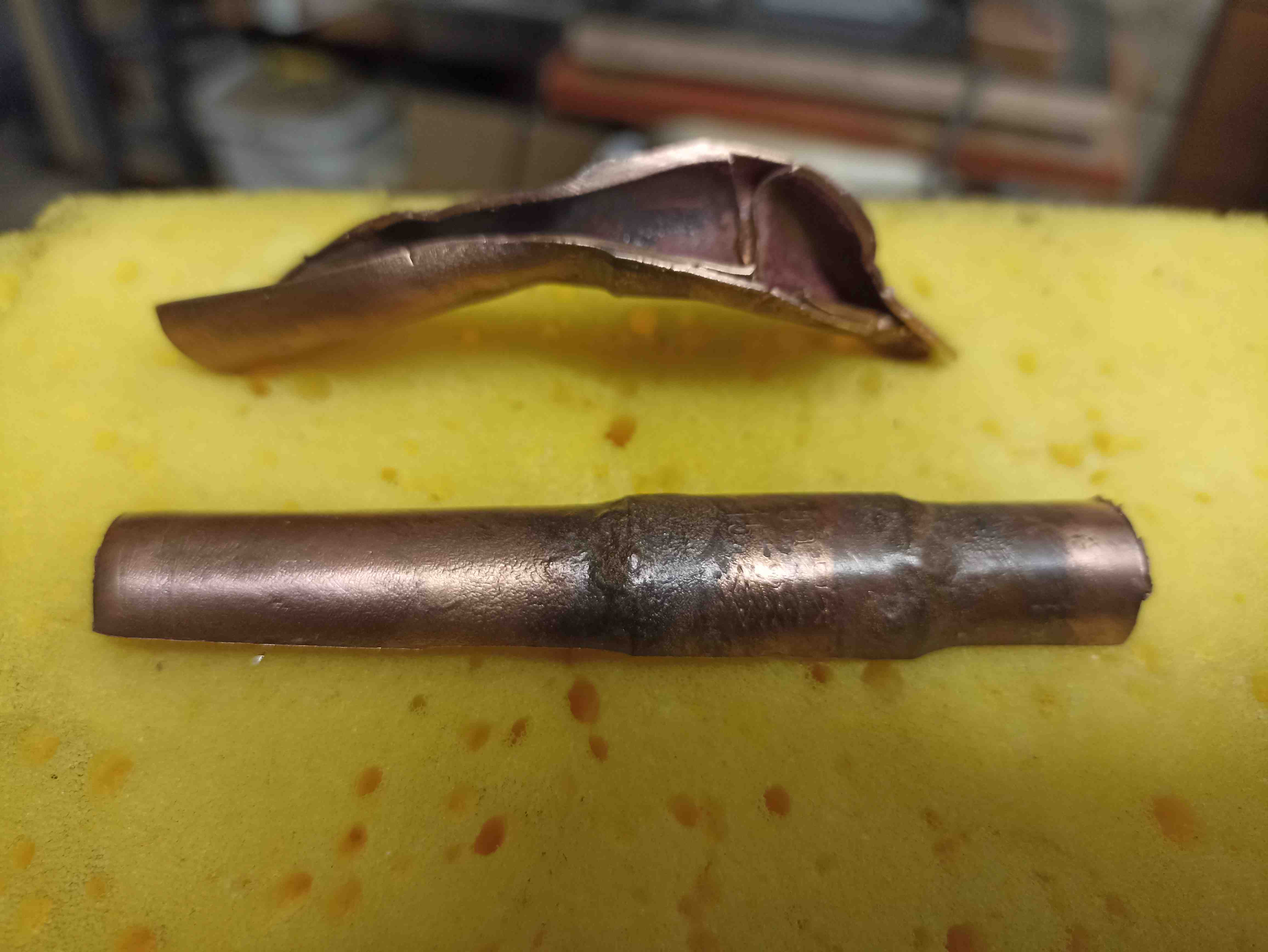 Ah, ära tagitumisele tähelepanu pööra, sest nagu alguses kirjutasin, siis on mul katsetamiseks hulgim meetreid mahavõetud torusid. See pildil olev on veel puhtaks tehtud peale lahti lõikamist, sest tegelikult oli sisepinnal ca 1mm kiht mingit ollust. Toru oli kasutusel küttesüsteemis. Lahti lõikamise eesmärk oli näha, kas joodis oli läinud ka liitmikute vahele. Mingil määral isegi oli. Liitmiku pinnad tegin enne jootmist ikka puhtaks niis seest kui ka väljast.