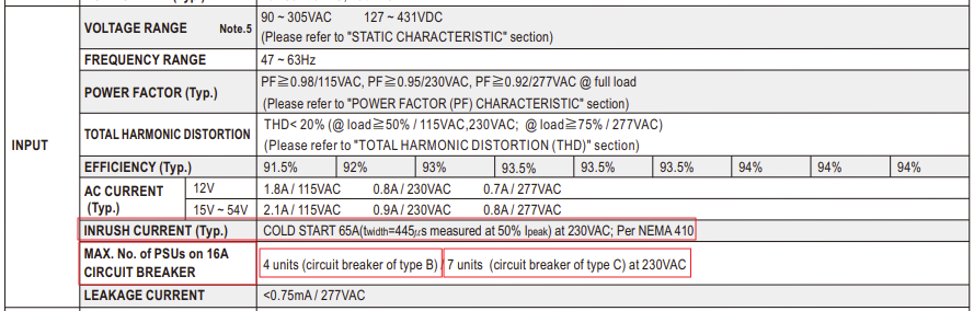 Elektrik mõtles juba kaugele ette. Hetkel Urmasel see praegu vaevalt teemaks, aga kui tahad nt tulevikus keldripimeduses avada "põnevate taimede" kasvatuse, siis LED-valgust kõvasti vaja. LED-toiteplokkidel on aga oma iseärasused. Allpool näidisena 180W 24V LED toiteploki Mean Well HLG-185H-24A spetsifikatsiooni väljavõte 16A kaitselüliti korral. LED-valgustuse ja nende toiteplokkidega tuleb valgustusahelatesse sisse elektrimootorite raskestikäivitumise voolutõuke sarnasus. Õnneks pole see siiski valdava osa kodukasutajate teema, kuna tavakoju paigaldatud valgusteid ühe KL taha vaevalt nüüd kilovati kaupa satub.