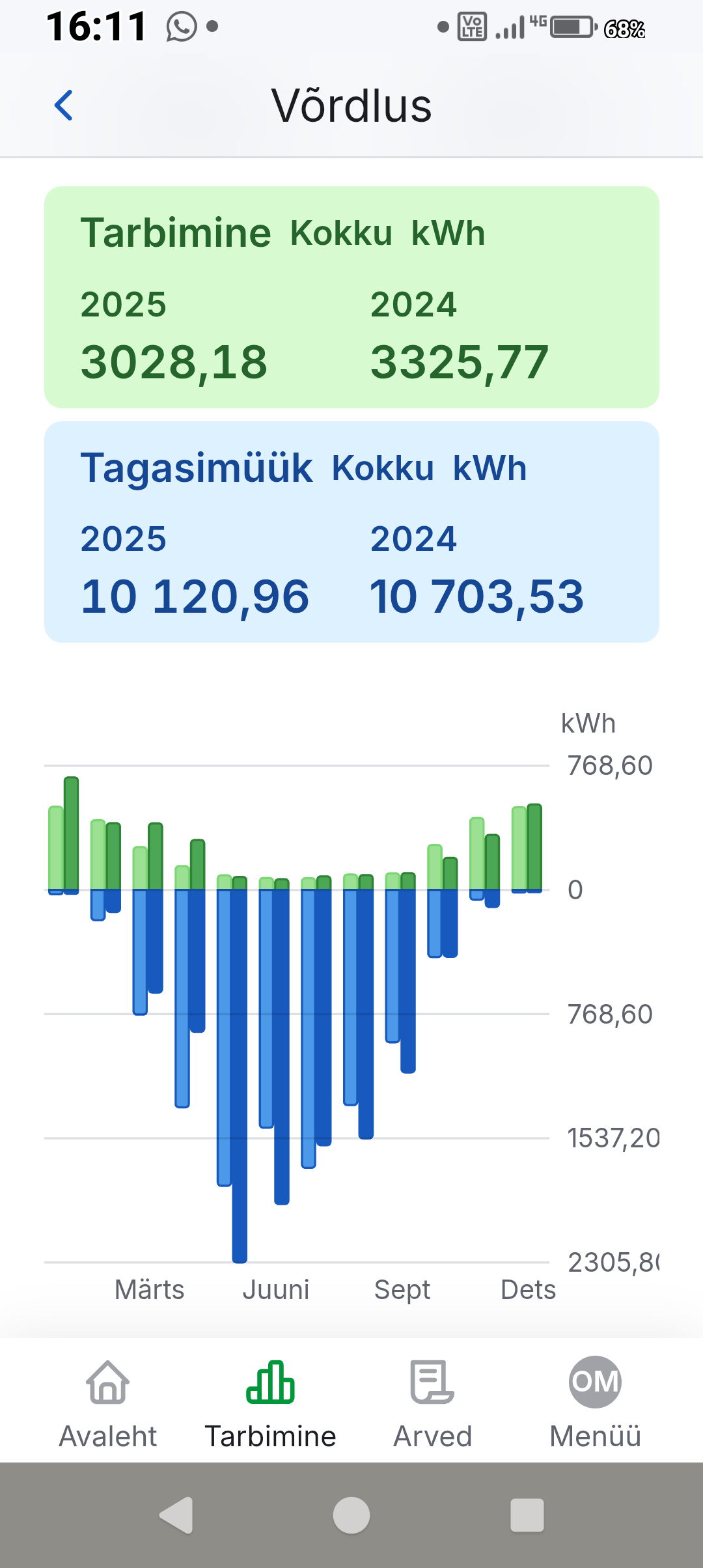 Jälle aasta möödas ja tarbimine võrgust on veel vähenenud 10%.ping kirjutas: 03 Jaan 2025, 23:27ping kirjutas: 02 Sept 2024, 23:21 Ajaloos tuhlamine tõi välja, et 2023 aasta energiakulu tulemused ei ole mul veel ülestähendatud ja varsti tuleb jälle uus aasta.ping kirjutas: 06 Jaan 2023, 15:05 Kuna aasta tagasi juhtisin avalikuse tähelepanu energiahindade jätkuvale järsule tõusule, siis ise korrigeerisin kohe ettenägelikult hoone energiakasutust ja saavutasin 2022 aastaks sellise aasta energiakasutuse tulemuse mis tagas vaatamata elektrihinna tõusule positiivse rahavoo.