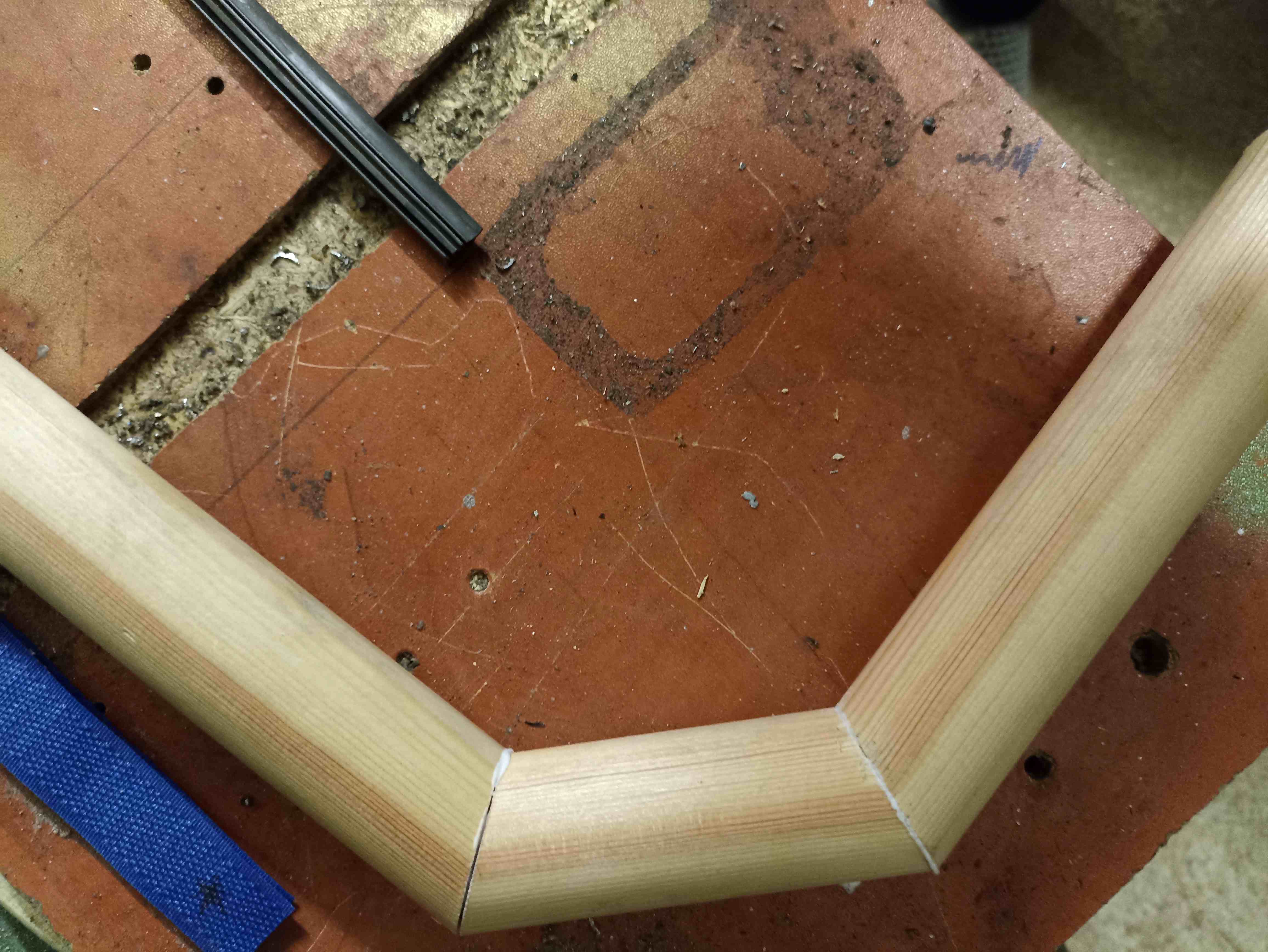 Proovisin hommikul seda varianti, kus puurisin 8mm augu läbi kolme nurgadetaili ja pikk puittüübel sisse. Täiesti toimiv variant, ainult pean veel katsetama, et kuidas saada ühe puurimisega auk läbi nii, et detailid puurimise ajal omavahel lahti ei tuleks. Kui on otsapidi kokku liimitud ja kuivanud, siis saaksin kahe lauajupi vahele panna ja kruustangidega paigal hoida.