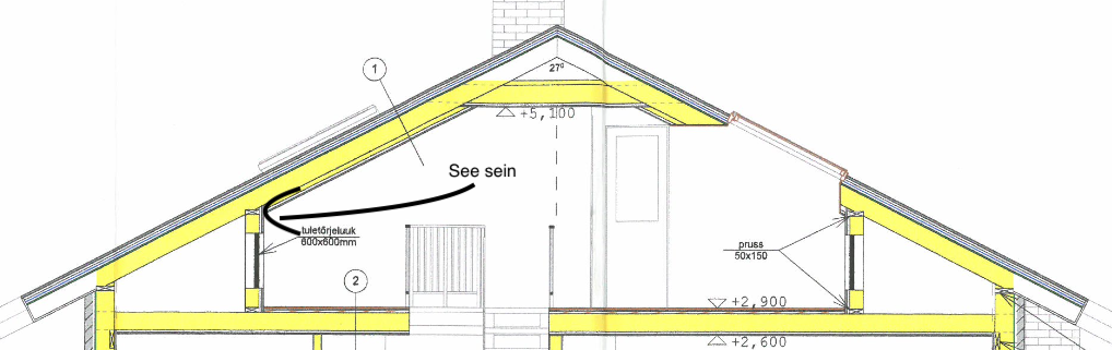 Pilt kahjustusest Ristlõige Omaniku sõnul on põhjuseks 6 aasta tagune lume torm, mille käigus siis ilmselt puhus lund katusekivide vahele ning kus see hakkas sulama ja tuppa voolama. Projekti järgi vaatasin, et katusenurk on 27 kraadi ja materjalideks on: