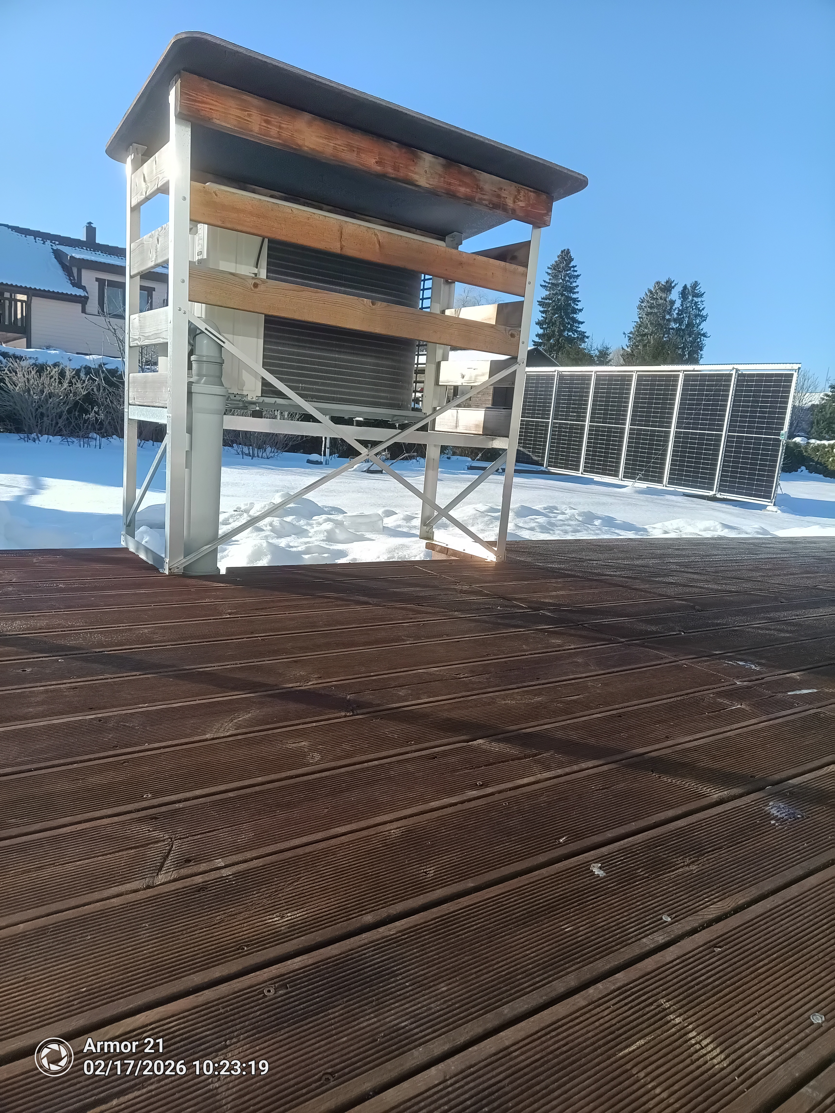 Püstised paneelid toodavad kell 10.30 75% võimsusega, päikseterrassilt on lumi sulanud, aknast paistev päike kütab toa soojaks ja maja lõuna- ja põhjapoolse külje õhutemperatuuride erinevus on päikse käes üle 13C.