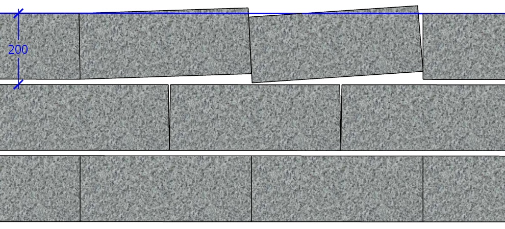 Mis saab aga siis, kui ei ole täiesti täpsed? Kahes ülemises reas ongi plokid, mille küljed on trapetsikujulised, kus alumise külje pikkus on ploki nimimõõt 480 mm, aga ülemine serv mõned millimeetrid lühem. Sellisel juhul emb-kumb, kas tulemus hakkab olema nii nagu teises reas, kus vertikaalvuukidesse jäävad kiilukujulised vahed.