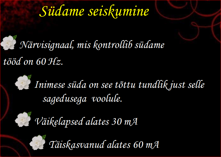Veel 1 netist leitud väide https://dea.digar.ee/?a=d&d=AKsotspollu ... ---------- :ise olen katsetanud enda peal väikestel pingetel nii vahelduvat, kui alalist. vahelduv tõmbab lihased krampi, aga alalisvool tekitab puutepunktis põletuse tunde. 1mA alalist üle näppude on juba väga ebameeldiv. 2mA-ni ei kannatand tõsta, sest puudutus oli juba tõsiselt valus. et vältida organismi üldist mõjutamist, siis katsetasin näppude vahel. pinged sai ka sedapuhku väiksemad. 60V mõlemal pingel(AC/DC) on umbkaudu lävi, kus pinge hakkab korralikult tunda andma. vahelduval kusjuures pigem madalamal pingel