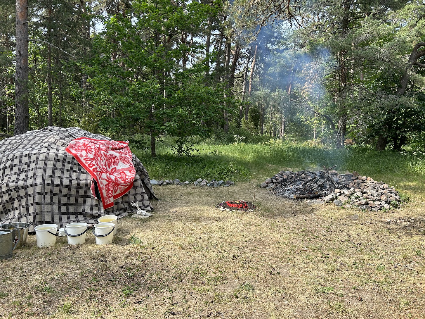 Päris nii ehedas indiaanisaunas, kus õues kive köetakse, pole õnnestunud käia. Küll aga sellises, kus enne köetakse kivid ära ja siis telk peale. Pimedal sügisõhtul kumab see ahi seest punaselt, nagu aladdini lamp.