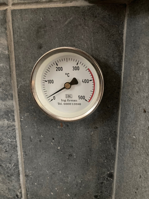 Kes keelas selle juurde veel pista gaasikulgla erinevatesse osadesse erinevaid andureid. Mul on ahjul suitsukanalis (korstnalõõris) termomeeter (pilt allpool) ja tänu sellele väljundi olukord pideva kontrolli all. Selles mõttes on mul olemas selline info, mida paljudel jutuMeistritel ei tundu olevat ehk veidi ikka tean, mida kirja panen.