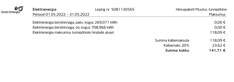 Sedaviisi arvutades on minul 0,12 + KM ja koos käibemaksuga 0,144.rst kirjutas: 06 Juun 2022, 13:57Mul tuli börsihind tunnitarbimisega 0,158s/kWh+km (koos taastuvenergia tasuga)
