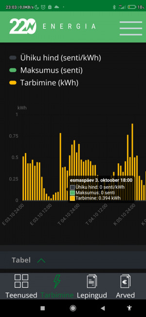 Alexy kirjutas: 07 Okt 2022, 16:40 Üks tagasihoidlik küsimus erivate müüjate äpi kasutajatele: kas mõnes äpis näeb lisaks kogusele ja jooksvalt hinda?(ehk siis jooksva kuu kogus ja hind, mitte tunnid ööpäeva lõikes eraldi) Eesti energial seda pole, seega huvitavad teised "vahendajad" ning just nutikas jooksvad asjad. Miks ma ise ei vaata-puudub võimalus isiku tuvastamiseks nutikas.