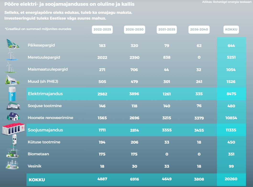 Eestisisese ja ühtlasi ka riikliku eesmärgi täitmiseks piisab meil jämedalt 1000 MW maismaatuulest + 1000 MW meretuulest, 1000 MW päikest ning 750 MW salvestusest. Lisaks on vaja 750 MW juhitavat võimsust (koostootmisjaamad, tipu-ja avariireserv biogaasil) ja kuni 750 MW väiketarbijate akusid. Tuumajaam ega põlevkivielekter ei mahu ega sobitu teekaardi järgi sellesse pilti. Ülejäänud mere – ja maismaatuul läheb ekspordiks.