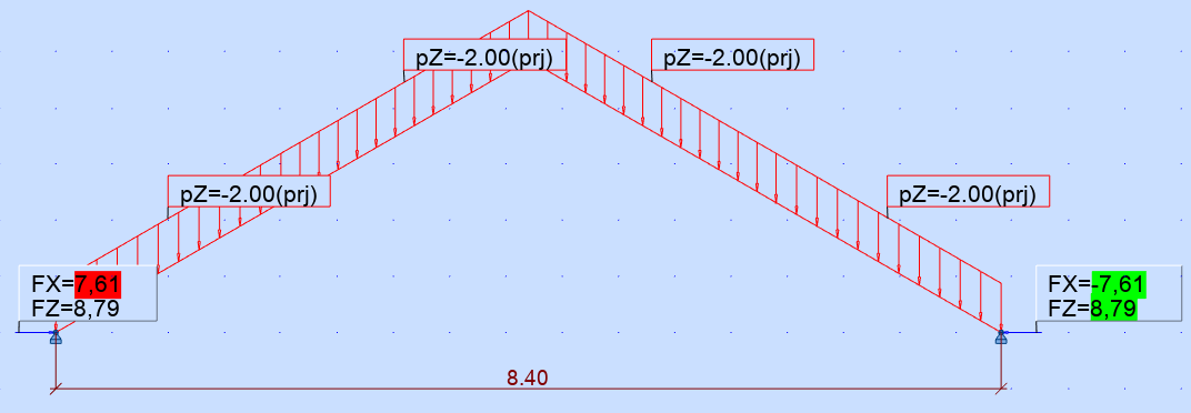 q = 18 x 8 / 8,4 ruudus so ca 2 kN/m2 mis vastab kenast katuse ühtlaselt jaotatud koormusele