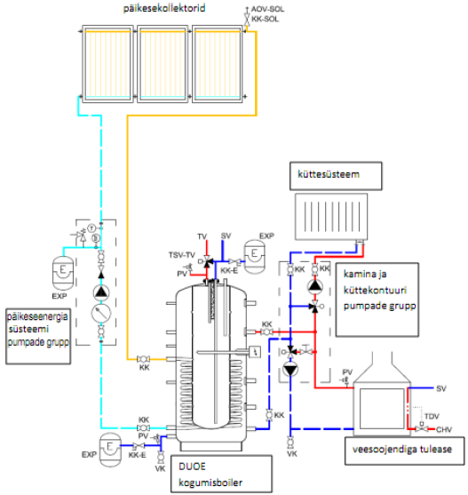 Keema vaevalt süsteem läheb, sest akupaak 750L on järgi ja kütmise ajal läheb akupaagist kuum vesi ka radikatesse. Kamin ise tehtud katla terasest ja ka korstnatoru, mis lõppeb kivikorstnaga. Praegu kasega küttes jääb keemispunktini veel maad.