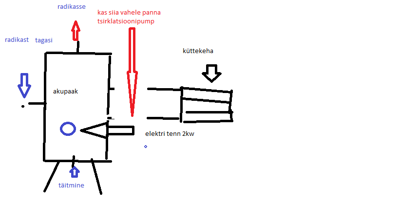 Sellise info alusel ei ole tsirkuleerimise vabaringluse nõue täidetud - kuum toru peab olema kõrgemal ja külm ots tulema kuumast allapoole. Jõnkse, kurve võib sees olla, kuid väga tähtis on torude kõrgused ja asukohad kerise ning paagi suhtes. Lisaks peab läbimõõt piisav olema, peenikese toruga ei pruugi toimida.