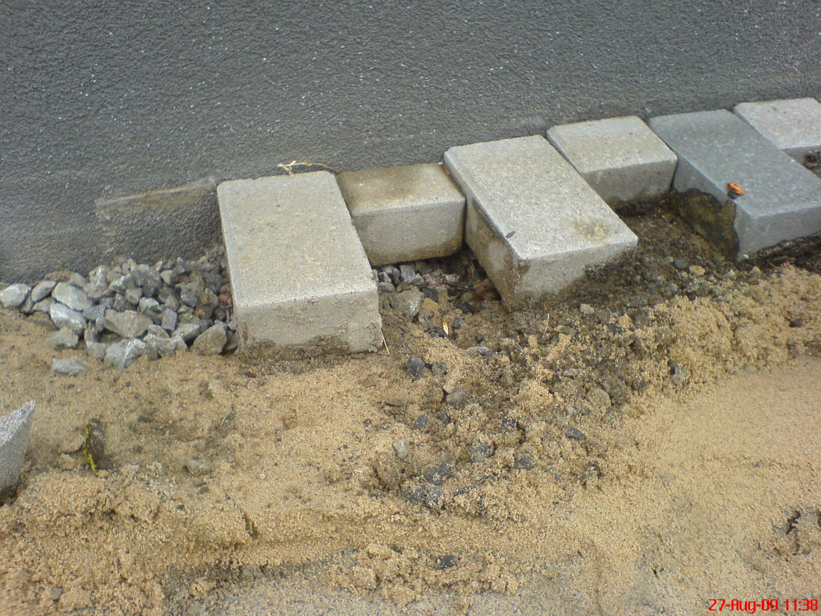 Näide sellest, et vesi on liiva läbi killustikupõhja uhunud. Peale selle võivad sipelgad liiva vuukide kaudu välja tassida. Kokkuvõttes tuleb peenkillustikku (max. terasuurus 4-8mm) isegi odavam, tulemus vastupidavam, töö saab kiiremini tehtud ... aga teie ärge uskuge, mäkerdage liivaga edasi sest "kõik teevad nii" ; "liivaga on parem" ; "ma olen kuus aastat liiva peale pannud"; "kivipaigaldusjuhises on niimoodi kirjas" ; "arhitekt on projekti liiva kirjutanud"; " saab liiva peale teha küll kui väikesed tõprad kontrolli all hoida" jne