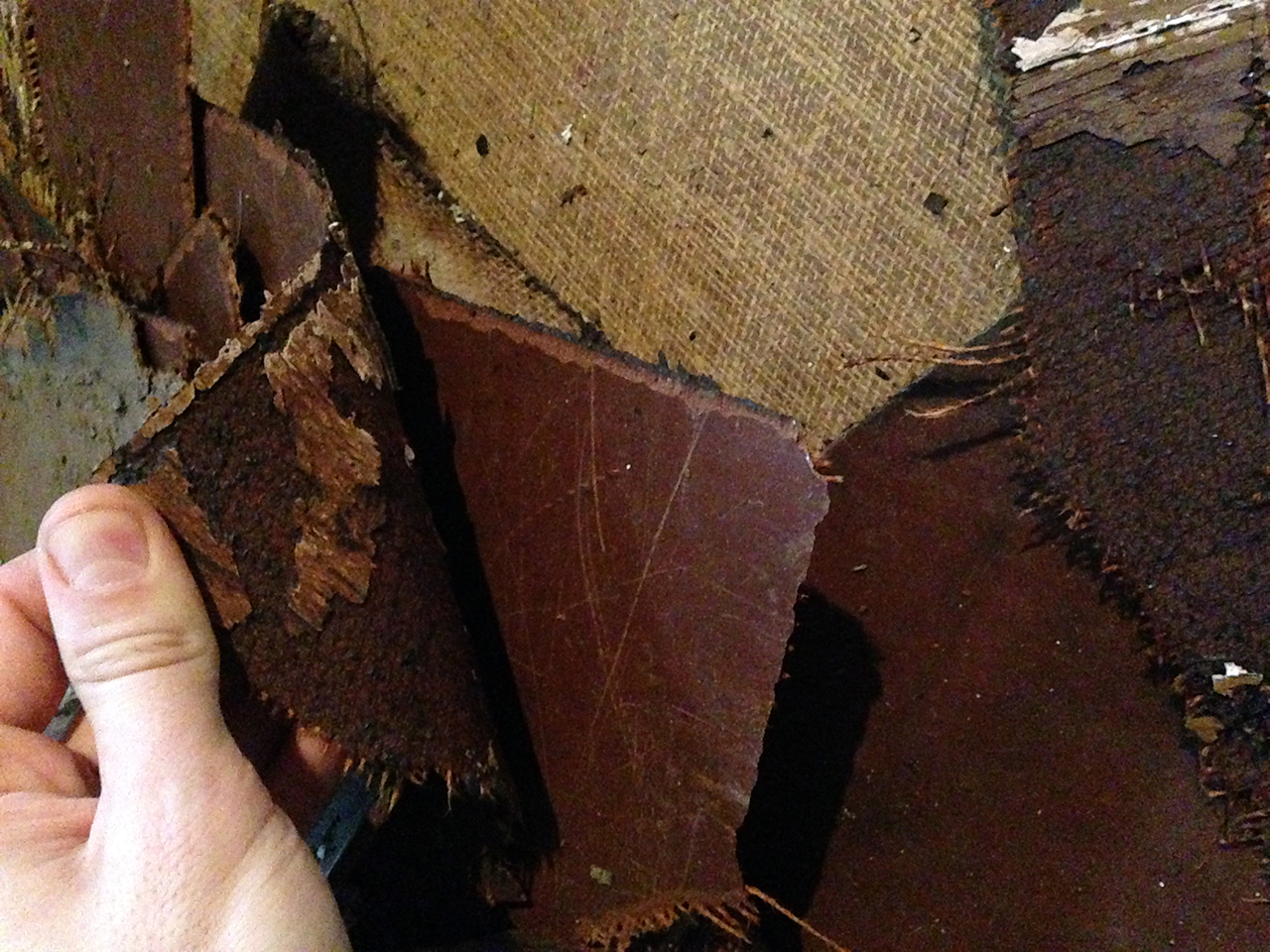 Suurem osa möödus probleemideta, kuid ühes kohas on linoleum või reliin (ei tea täpselt, mis materjaliga tegu) tõenäolselt kuuma saanud, ajapikku veidi sulanud ja põranda külge hirmtugevasti kinni jäänud. Paistab, et selle koha pealt läheb allkorrusel mingi soojatoru, kuna probleeme koht on üsna konkreetne sirge joon risti üle põranda.
