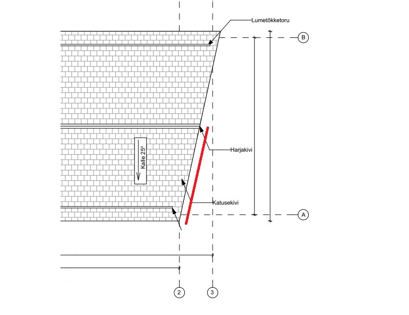 EI osanud pealkirja paremini sõnastada. Maja üks külg on nurga all (ca 14 kraadi) ning selle tõttu ka katuse üks pool lõigatud. Lisan postitusele joonise, kus punasega näidatud probleemne serv. Seal hakkab vesi otse tuulekasti peale jooksma. Katusekatteks tuleb Monieri Elegant Plus kivi ning võimalusel tahaks kasutada ka äärekive.