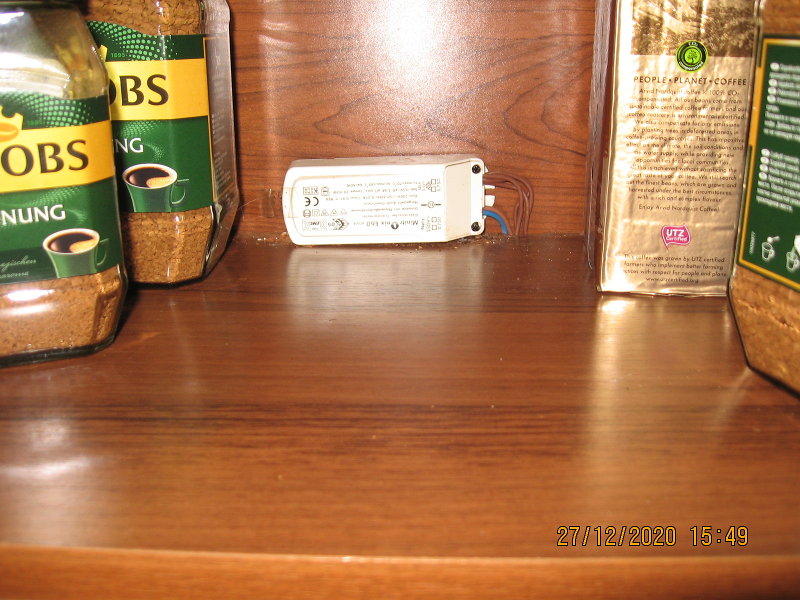 Seinakapist purkide tagant avastati 11,5v toiteplokk (pilt all). On selline paigutus OK? Kui pole, siis kuhu mööblivalgusti toiteadapteri peaks paigutama? Kas sarnaste toiteplokkide puhul tulerisk ka on? Guugeldamine andis, et toiteplokkidel peaks ümber olema 5-15 cm õhuvahet jahutuseks, aga mööblisse paigutamise kohta infi ei leidnud.